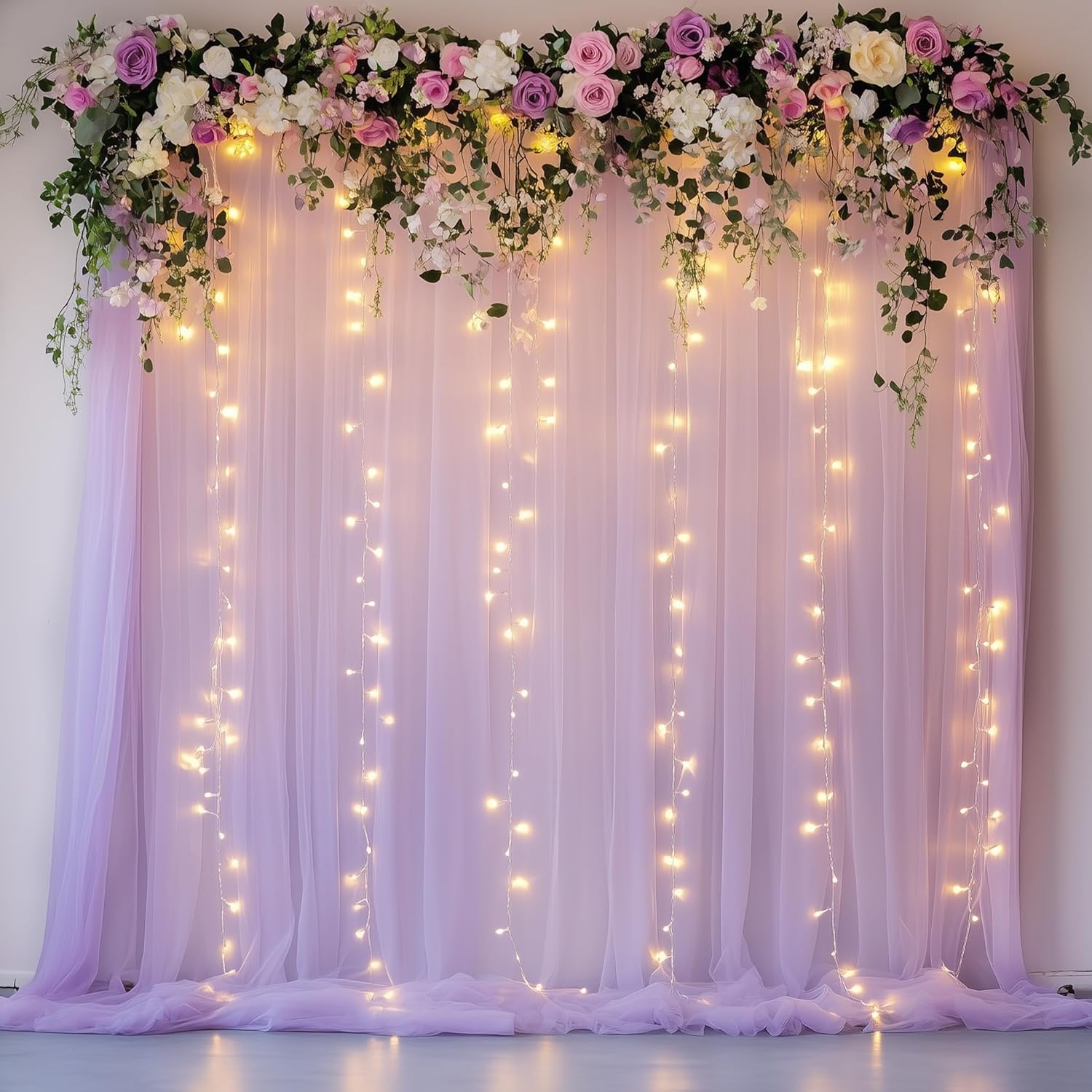 - Package Includes: 2 panels lavender tulle backdrop curtains, each sheer curtain backdrop is 5FT width and 8FT height. Also it includes a set of 10FT (10 strands) warm string light (USB powered,no remote control) and 12pcs transparent clips.