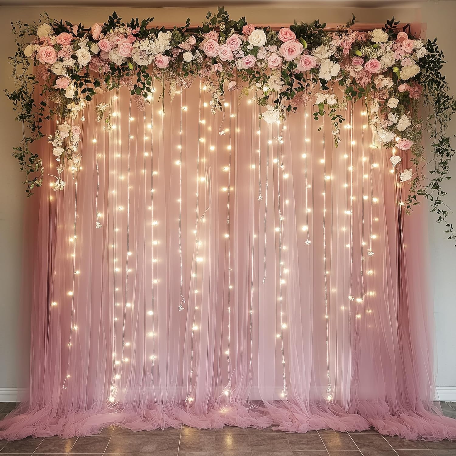 - Package Includes: 2 panels dusty rose tulle backdrop curtains, each sheer curtain backdrop is 5FT width and 10FT height. Also it includes a set of 10FT (10 strands) warm string light (USB powered,no remote control) and 12pcs transparent clips.
