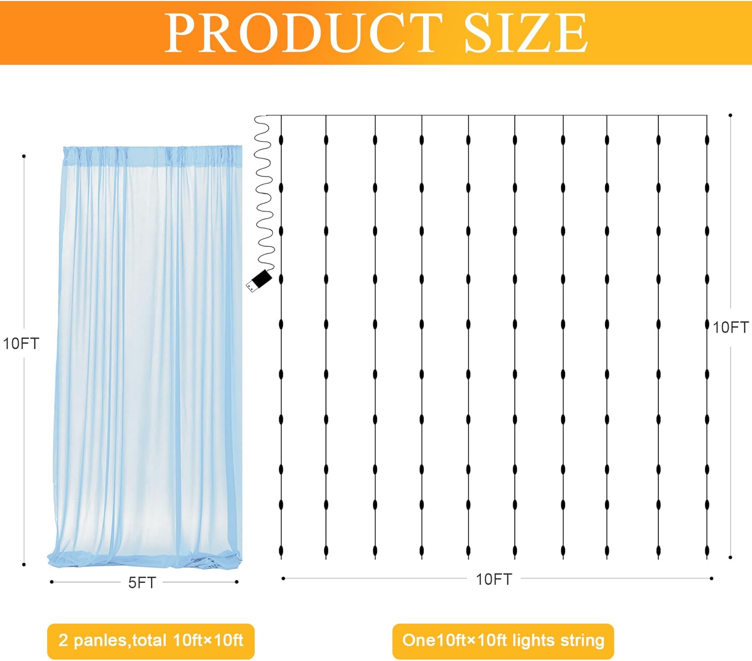 - Package Includes: 2 panels baby blue tulle backdrop curtains, each sheer curtain backdrop is 5FT width and 10FT height. Also it includes a set of 10FT (10 strands) warm string light (USB powered,no remote control) and 12pcs transparent clips.