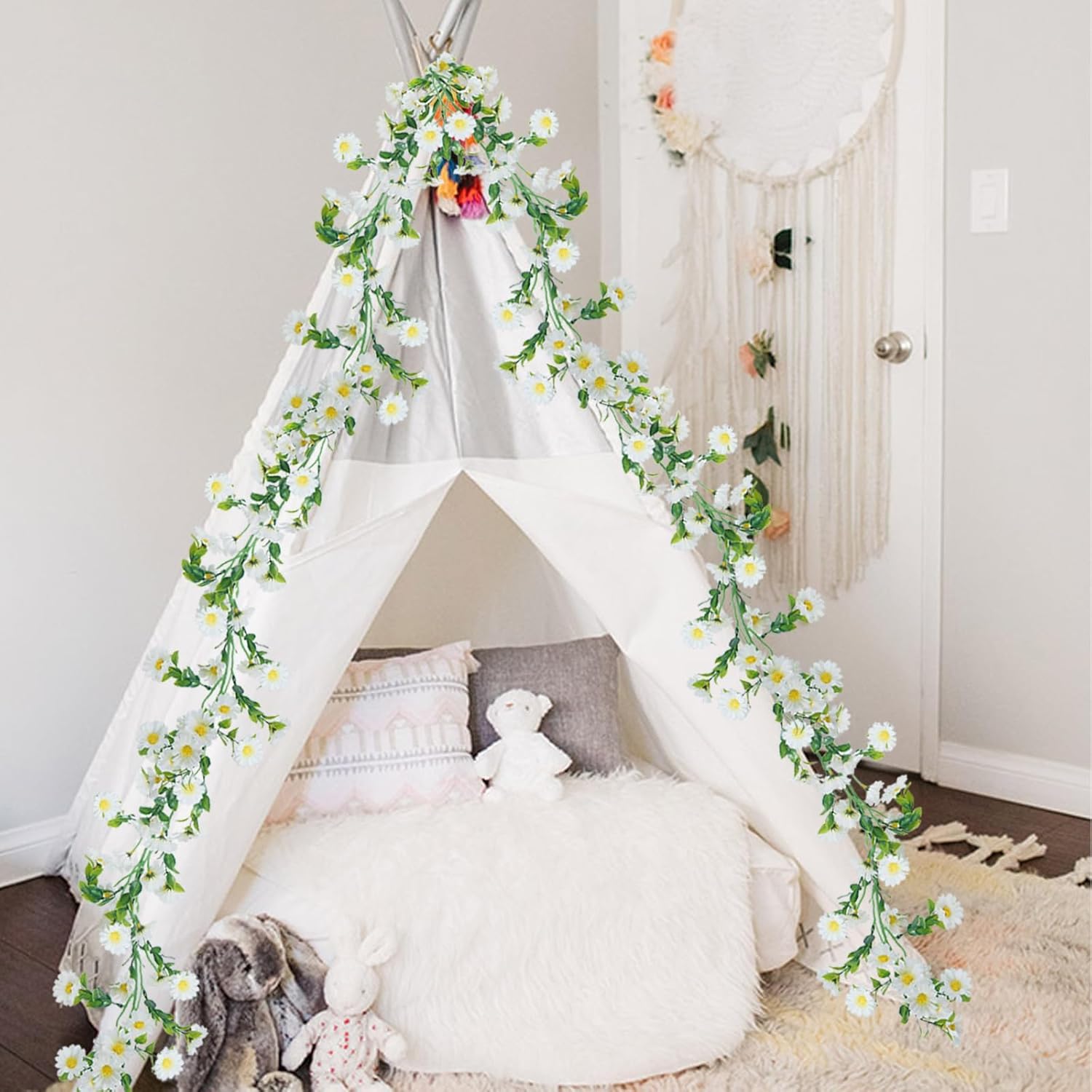 - Daisy flower garland is 2 meters/78.7 inches in length and contains 88 silk daisy flowers. Flower heads are about 4 cm/1.6 inches in diameter. Artificial vines has small holes at the end and is easy to hang.