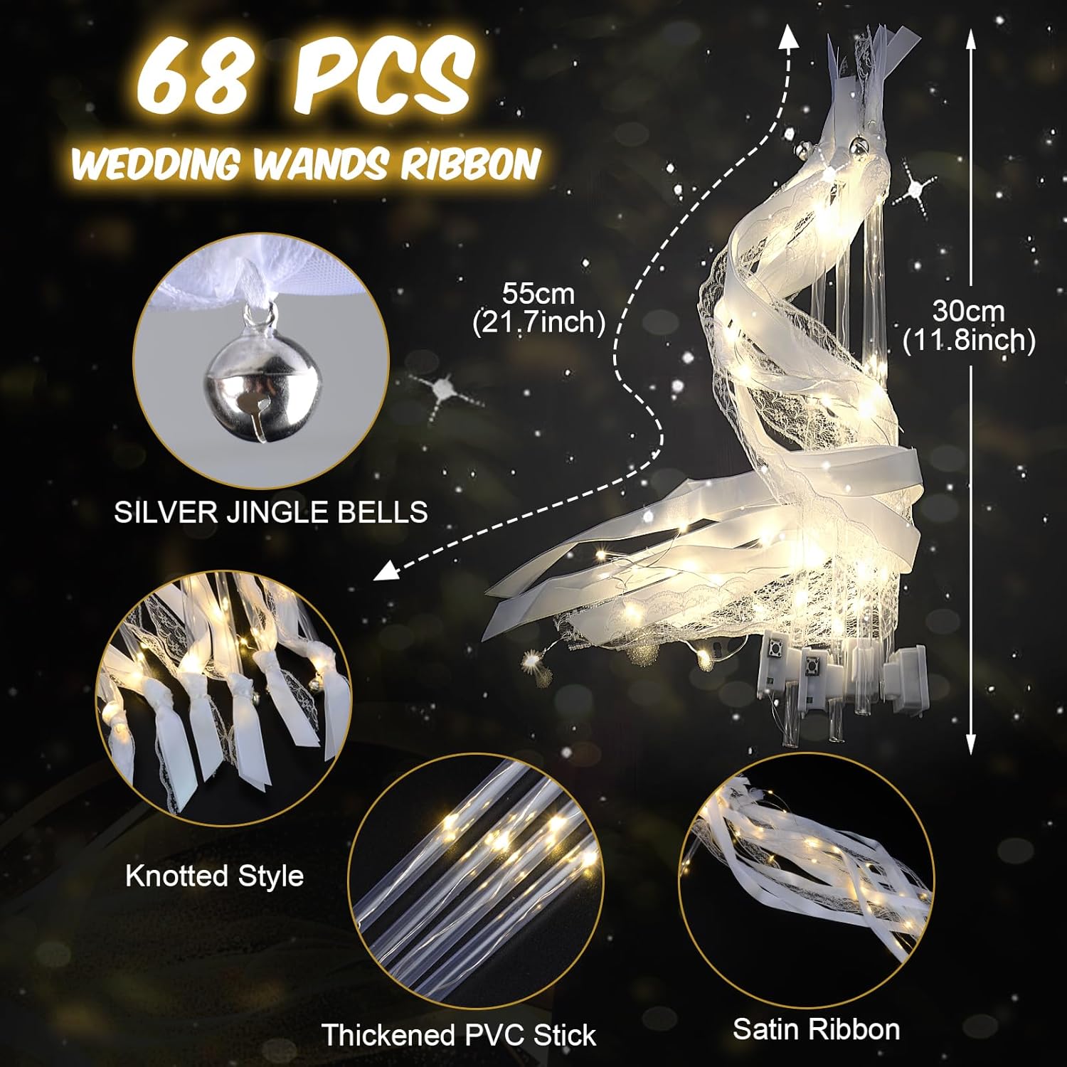 - LED Wedding Wands: We offer 68 white led wand, each adorned with four elegant white ribbons and a warm white LED light. At the top, a silver bell rings cheerfully with every wave. Glow-in-the-dark wands are ideal for long wedding send-offs.