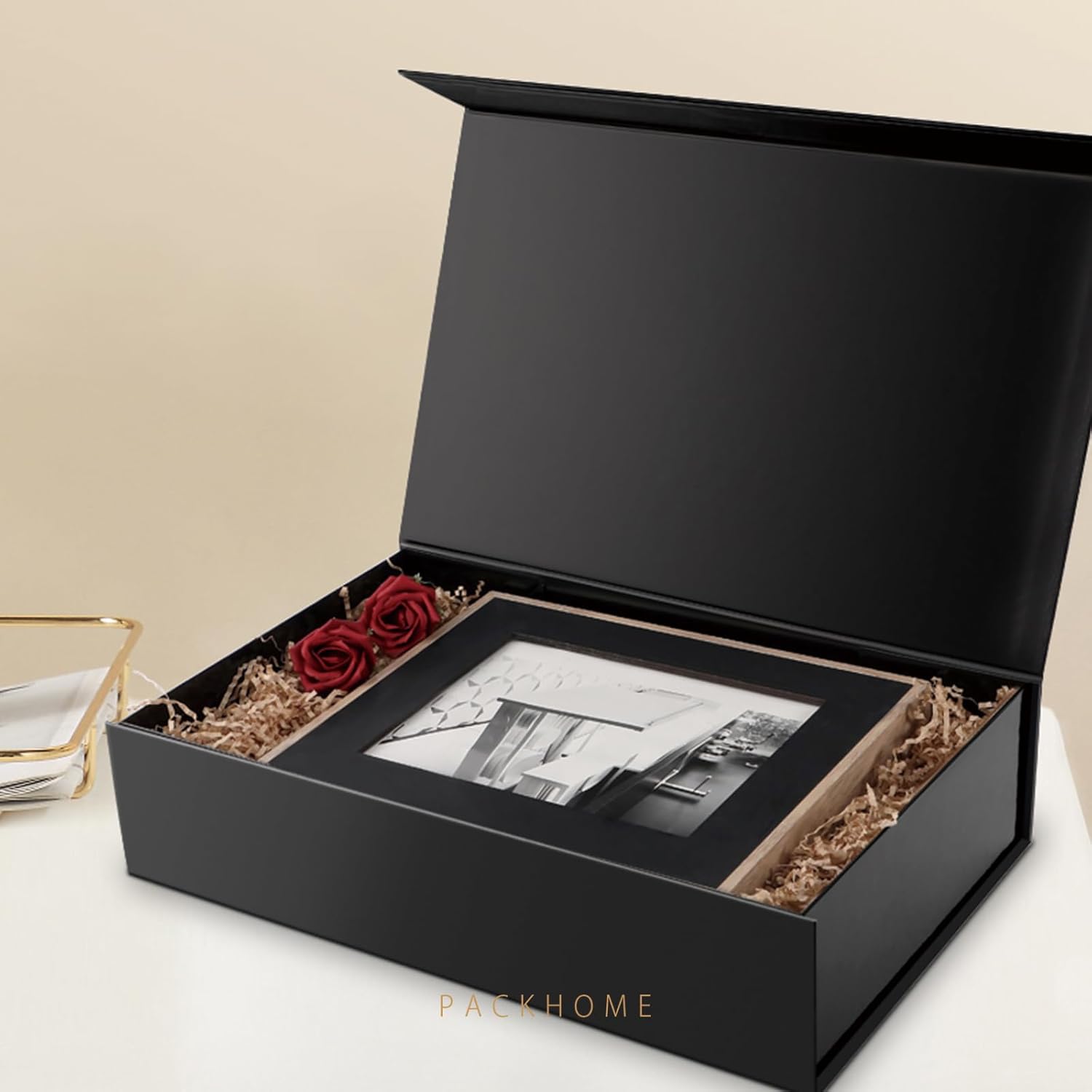- High Quality: The collapsible gift box is made from high-quality hardboard. Sturdy gift box with lid has a glossy black finish with neat flap. The tape used is from Tesa Germany