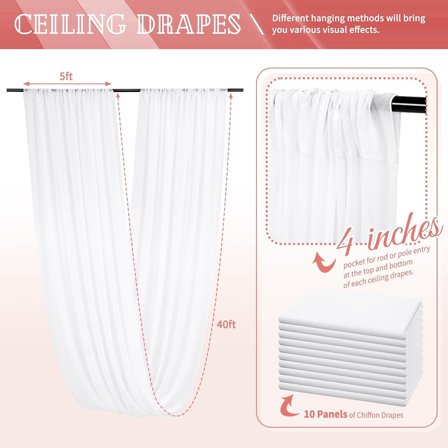10 Panels White Ceiling Drapes for Wedding 5ftx40ft Sheer Drapery Chiffon Fabric Arch Draping Curtains for Party Ceremony Birthday Baby Shower Reception Stage Ceiling Decorations