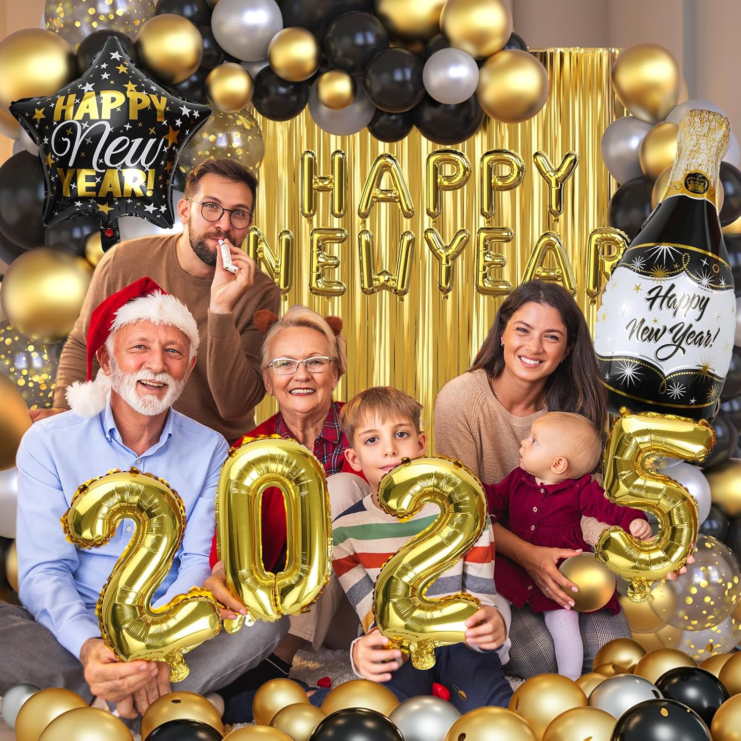 - ✨【2025 New Year Party Decorations】 New year's eve party decorations set: 30'' 1 new year champagne bottle foil balloons, 18'' 1 new year star balloon, 16'' 4 gold number 2025, 16'' 12 new year's banner, 12'' 5 gold confetti balloons, 10'' (13 black balloons, 14 gold balloons, 14 silver balloons), 5'' (3 black balloons, 3 gold balloons, 4 silver balloons), 1 tinsel foil curtain, 1 dot tape, 1 balloon chain. It is perfect for decorating for celebrations such as new year's eve.