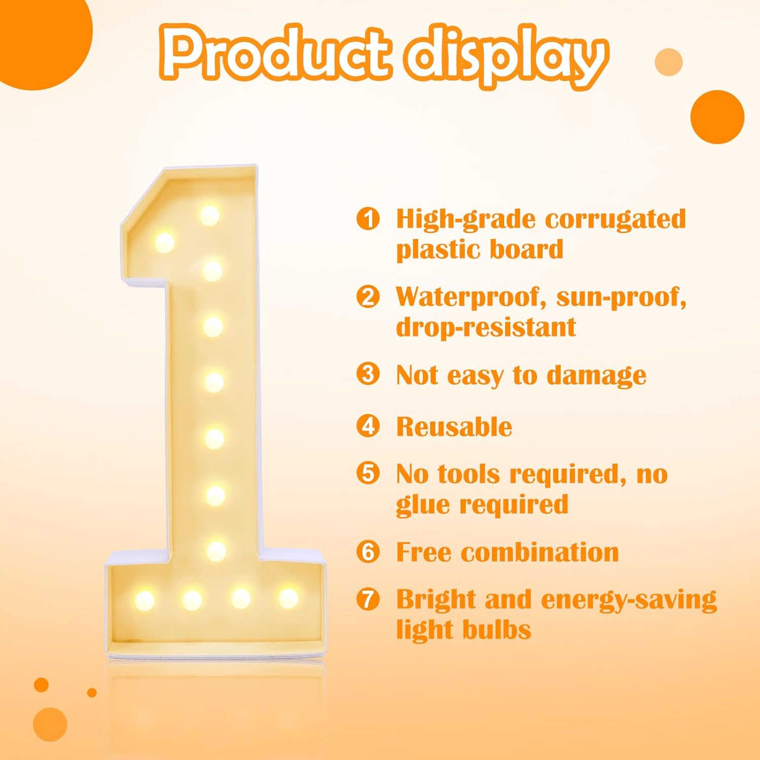 - Number 1 Light Up Number: Whether itβs a wedding, baby shower, or holiday party, these large light up numbers add a magical touch to any event. Our large marquee for numbers 4 Feet Tall and letters allow you to freely customize your party theme, a perfect backdrop to decorate any of your romantic parties and celebrating occasions. Many people choose to be happy birthday light up sign number lights