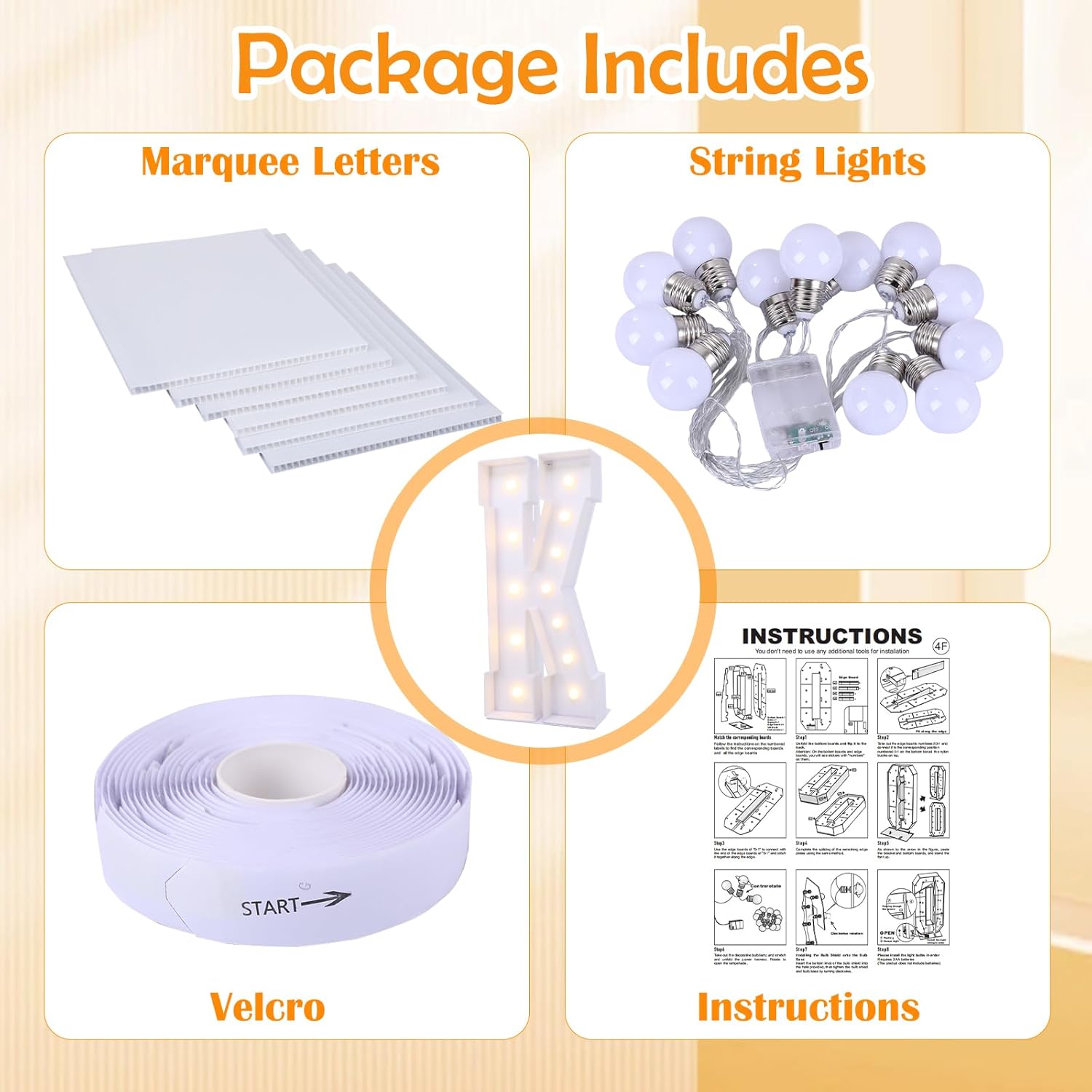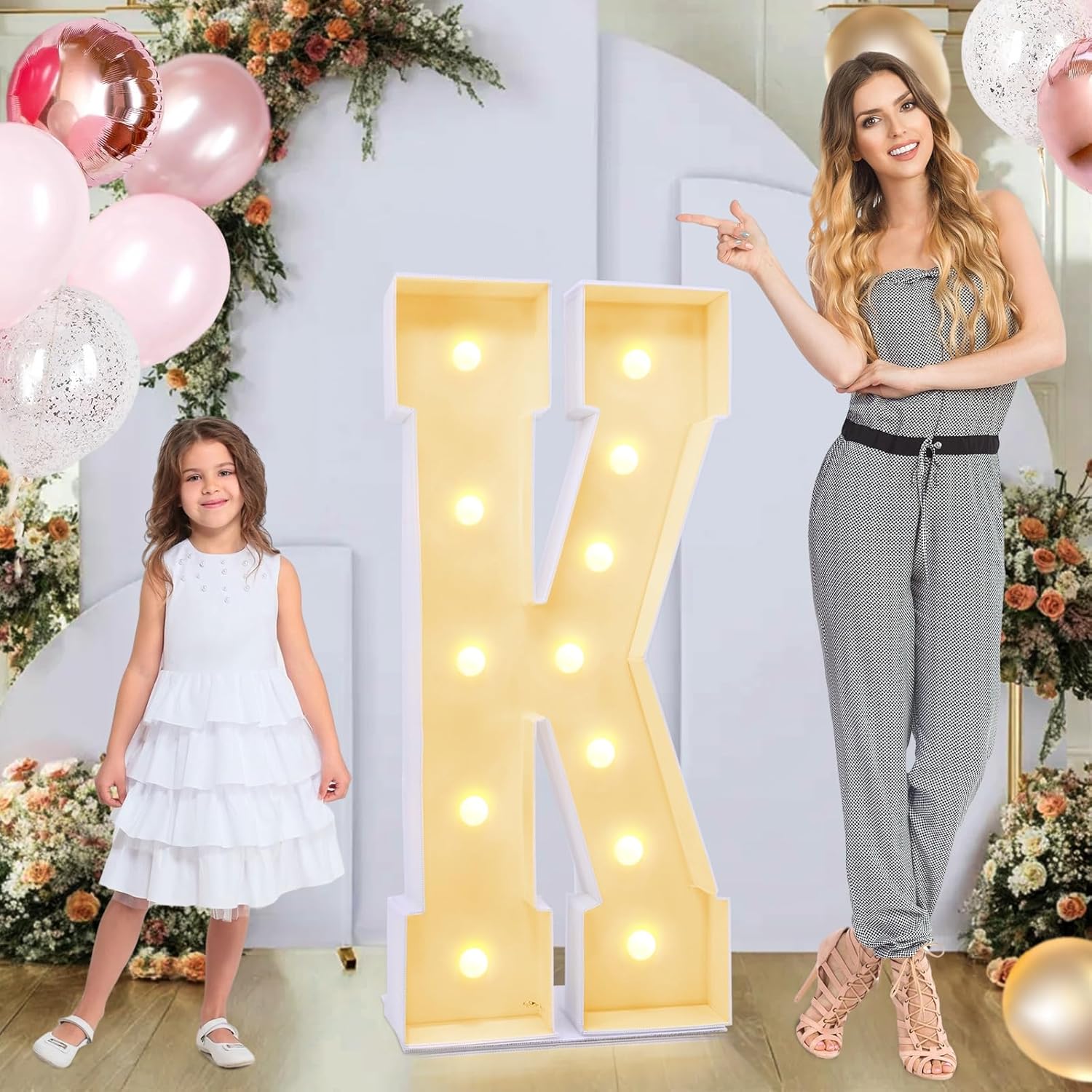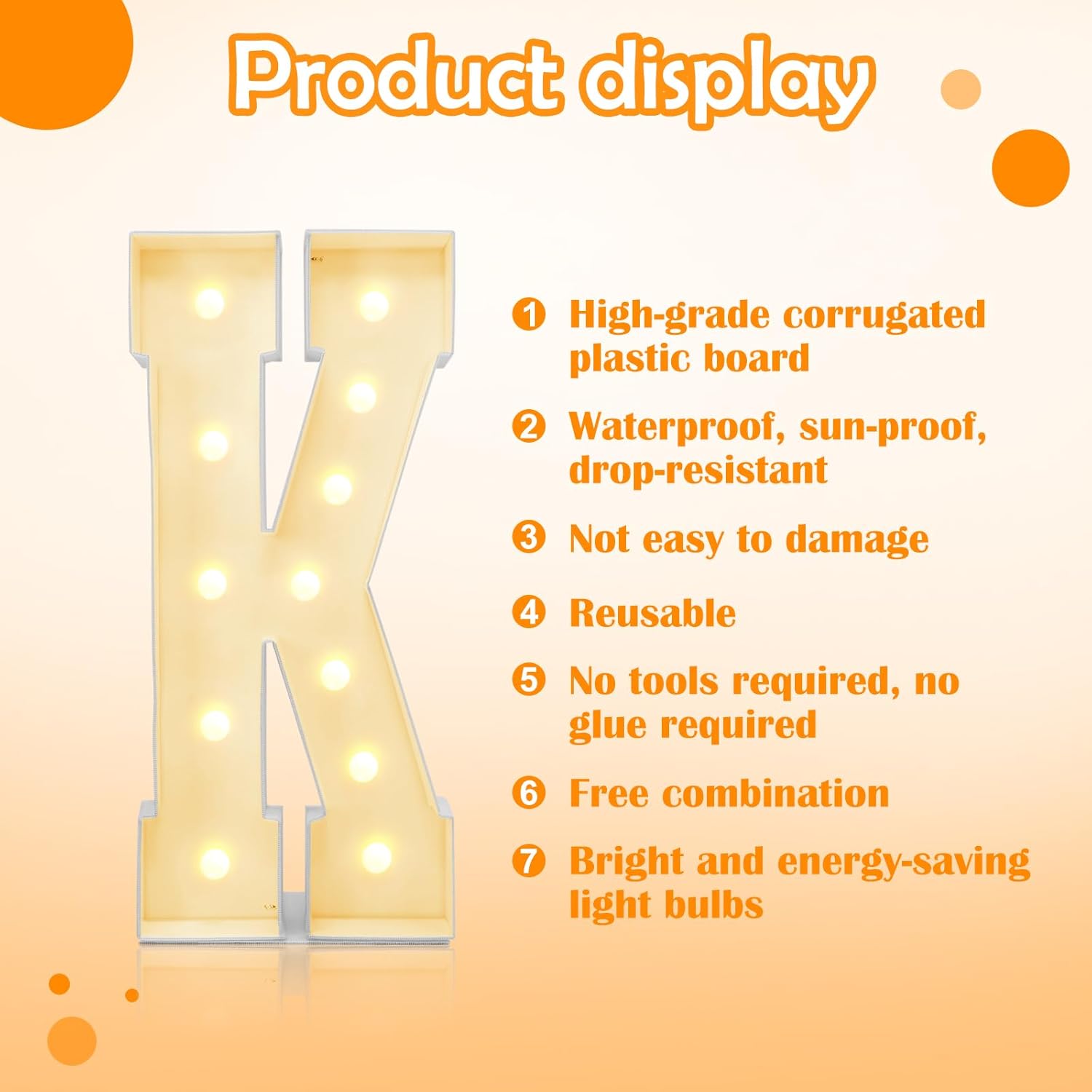 - Easy To Assemble Light Up Letters Light up k: Our unique 4ft marquee light up letters are not afraid of water and is not easily damaged. Pre-cut boards with clear markings help you set up your marquee light up letters with minimal effort, and quickly without any tool. The combination of letter balloons and fake flowers will make the decoration full of vitality, romance, and joy, adding a sense of celebration to the party. (Note: balloons and fake flowers are not included, you need to prepare them yourself)