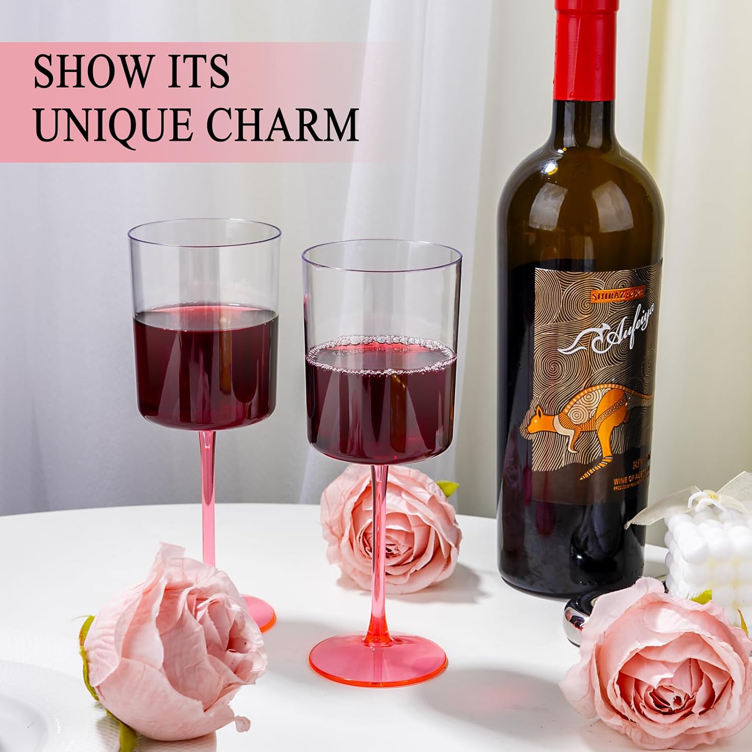 - WIDELY USED: Plastic stemmed wine glasses are suitable for outdoor, party, wedding, barbecue, picnic or car. The limousine industry has transitioned from traditional glassware to plastic for safety reasons. So our square wine glasses are nice choice for you. Our plastic wine glasses with pink stem can be used for whiskey, pink wine, cocktails, lemonade, juice, and even desserts.
