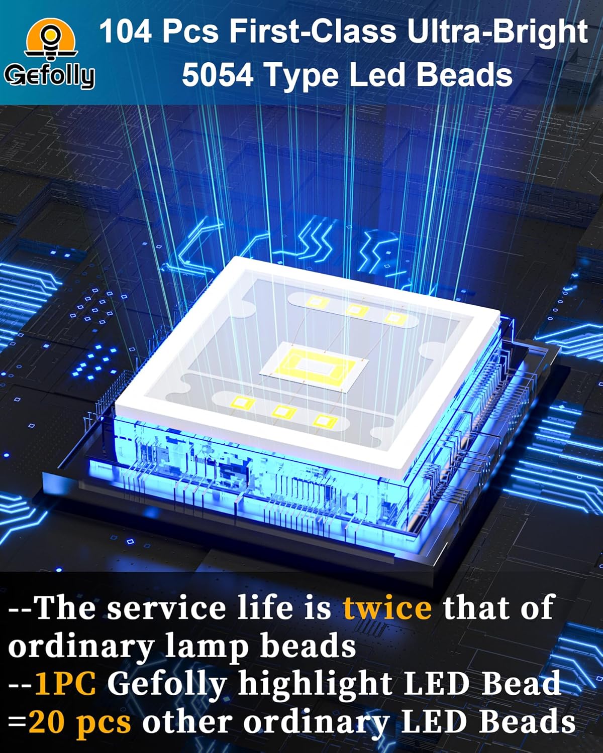 - [Ultra Bright 5054 Type Led Beads] - Designed with 104pcs first-class super bright 5054 type LED beads, 1 of our Gefolly beads is as bright as 20 ordinary beads. The lighting area is up to 3400 square feet, reducing lighting blind spots. Escort for the safety of you and your family. The first choice for night lighting.