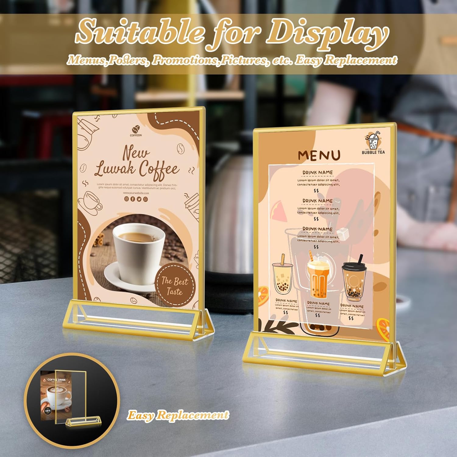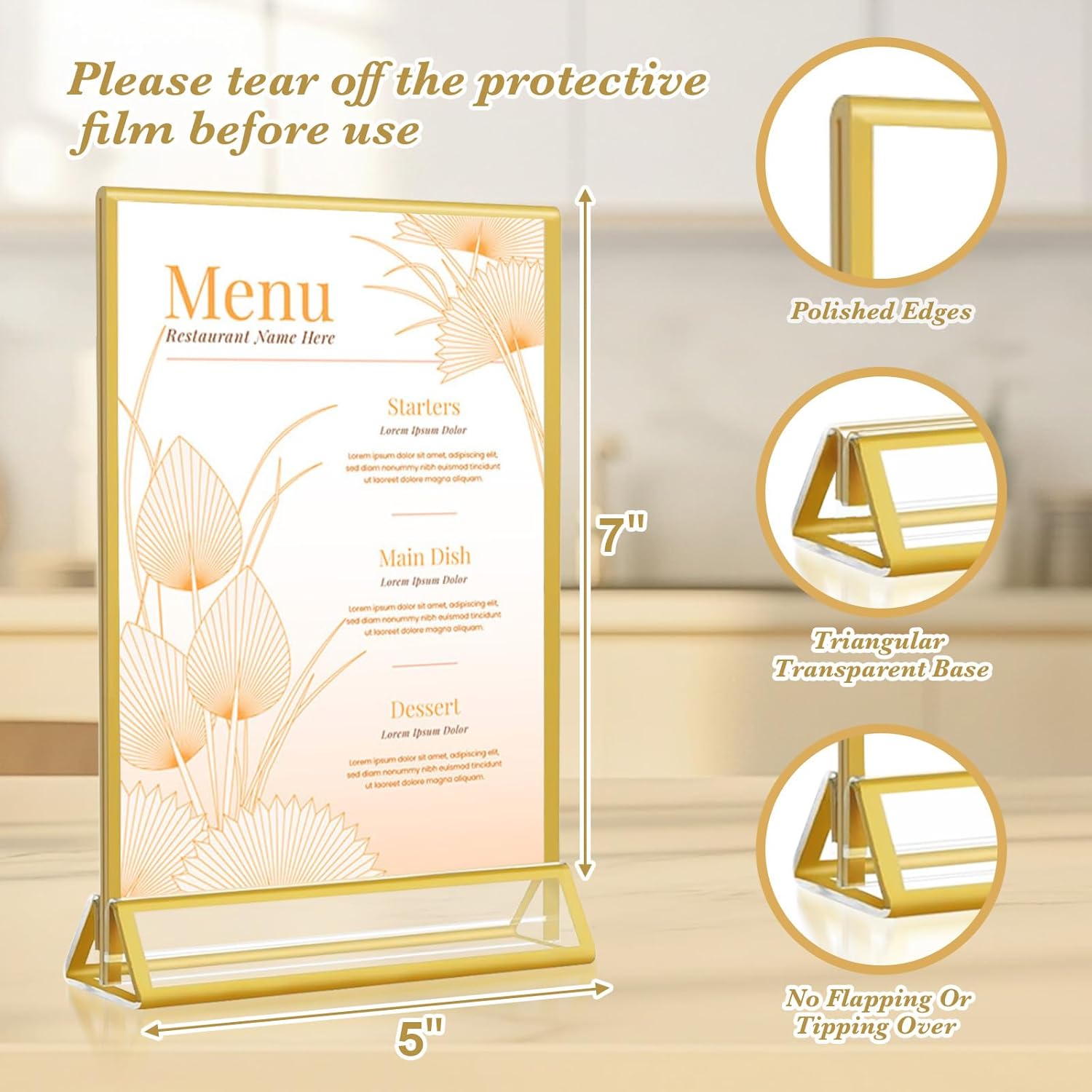 - 【Double-Sided Display Design】This uniquely designed 16 Pack 5x7 gold acrylic sign holder features a back-to-back double-sided display design. Its vertical double-sided structure ensures clear visibility of two photos or menu signs, making your table arrangement practical and visually appealing from any angle.