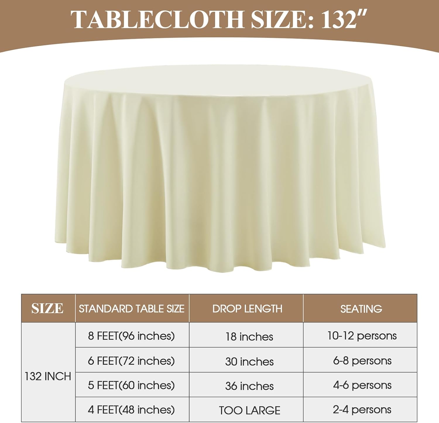 - Suitable Size: This polyester round tablecloth has multiple sizes to choose from, 90, 108, 120, 132 inches, which can meet the needs of tables of different sizes. In order to buy a tablecloth that is more suitable for your table, please measure the actual size of your table before purchasing and refer to our size chart
