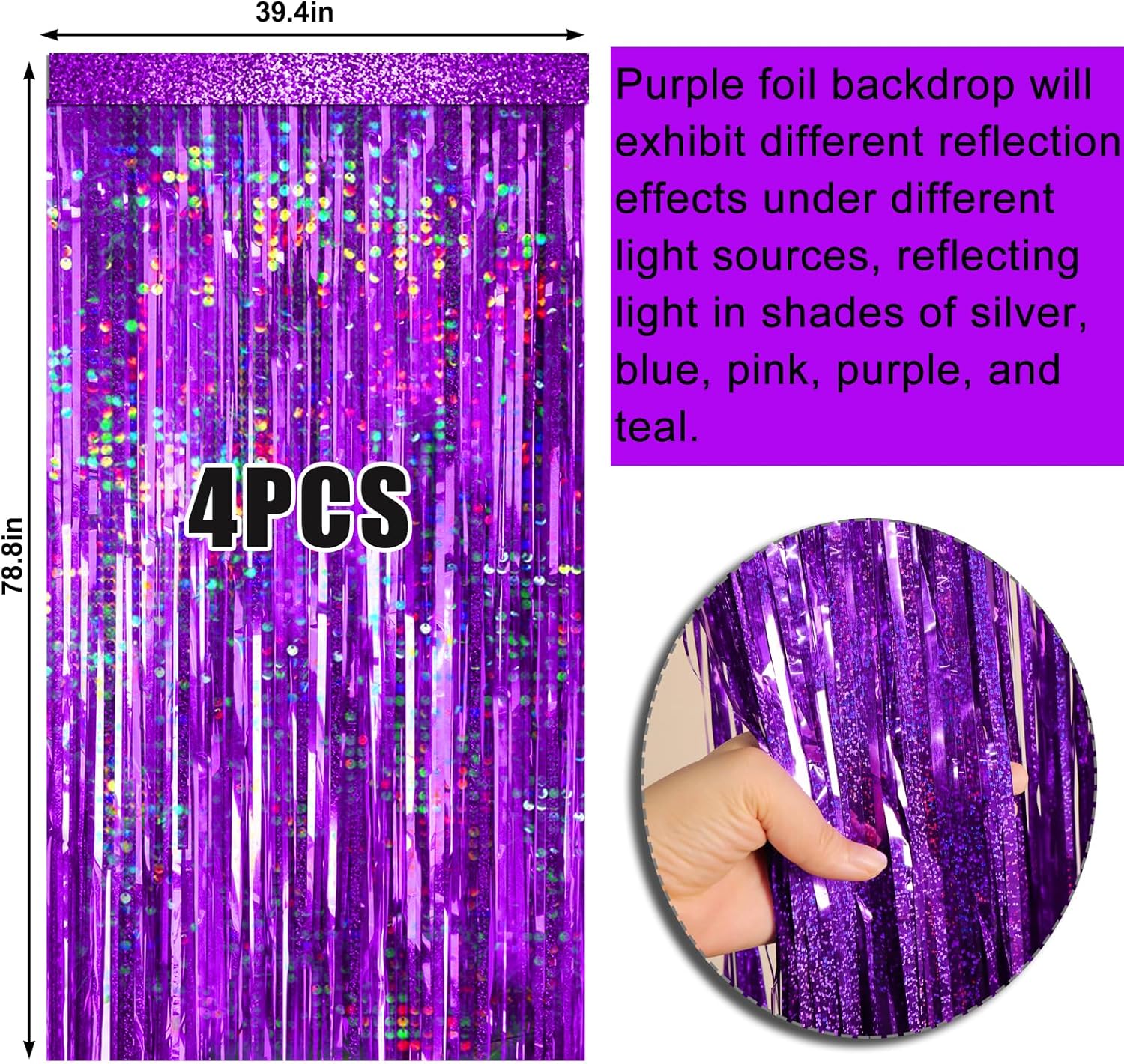 - Shimmery Purple Fringe Backdrop: You will get 4 pcs purple glitter tinsel backdrop. Size: 6.6ft*3.3ft. The foil fringe curtains are perfect for the door or wall to create an impressive decoration for parties, events, and photo booths.