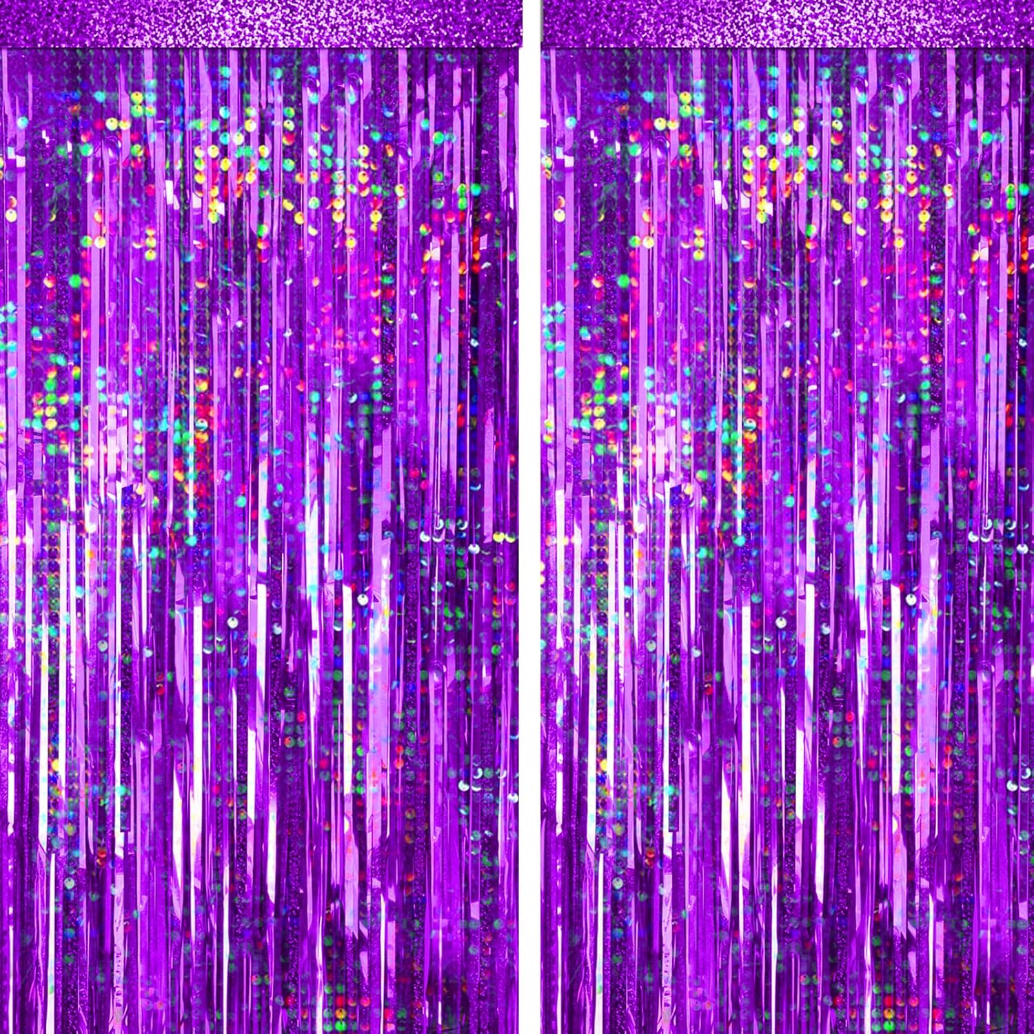 - Shiny Holographic Design: Different from usual purple backdrop, our fringe backdrop features a shiny holographic design, and it shows different color effects under different light, reflecting light in shades of silver, blue, pink, purple, and teal, that creates an eye-catching and mesmerizing effect. Perfect for the doorway, window, wall, living room, dessert table backdrop, and stage background decorations.