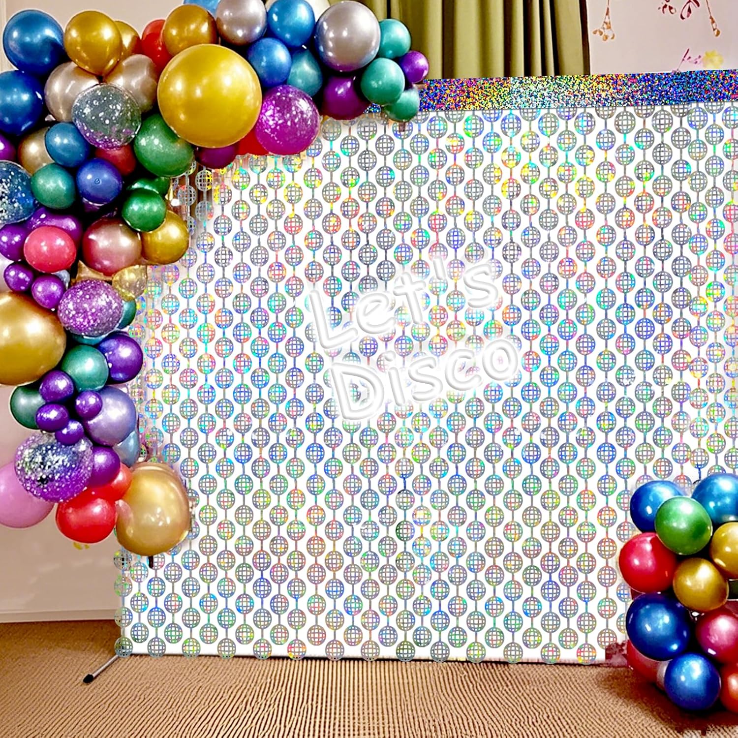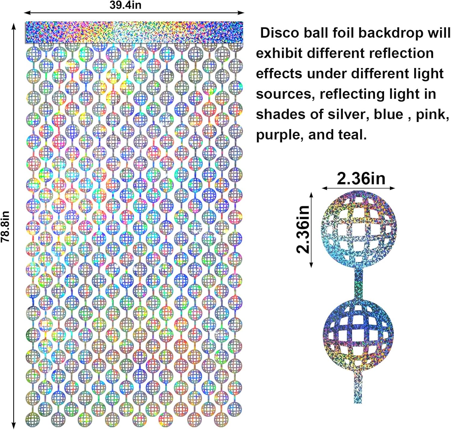 - Shiny Holographic Design: Different from usual disco backdrop, our disco ball backdrop features a shiny holographic design, and it shows different color effects under different light, reflecting light in shades of silver, blue , pink, purple, and teal, that creates an eye-catching and mesmerizing effect. Perfect for the doorway, window, wall, living room, dessert table backdrop, and stage background decorations.