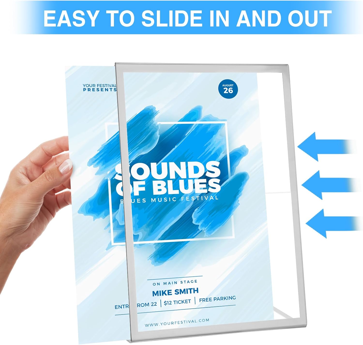 EHWINE 12 Pack Acrylic Sign Holder 8.5 x 11, Silver Picture Frame Stand up Table Top Sign Holders, Slanted Back Paper Holder Clear Display Stand Menu Flyer Holder for Wedding Party