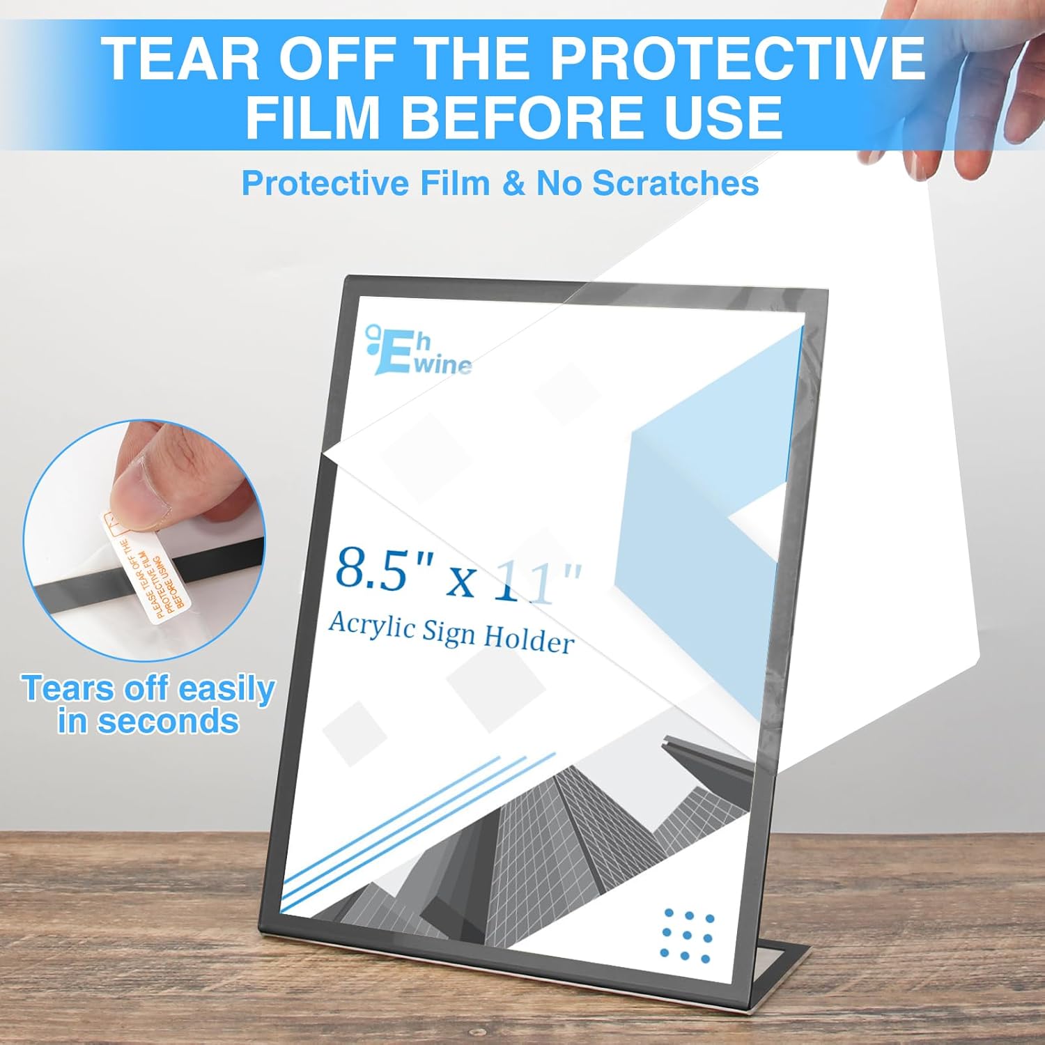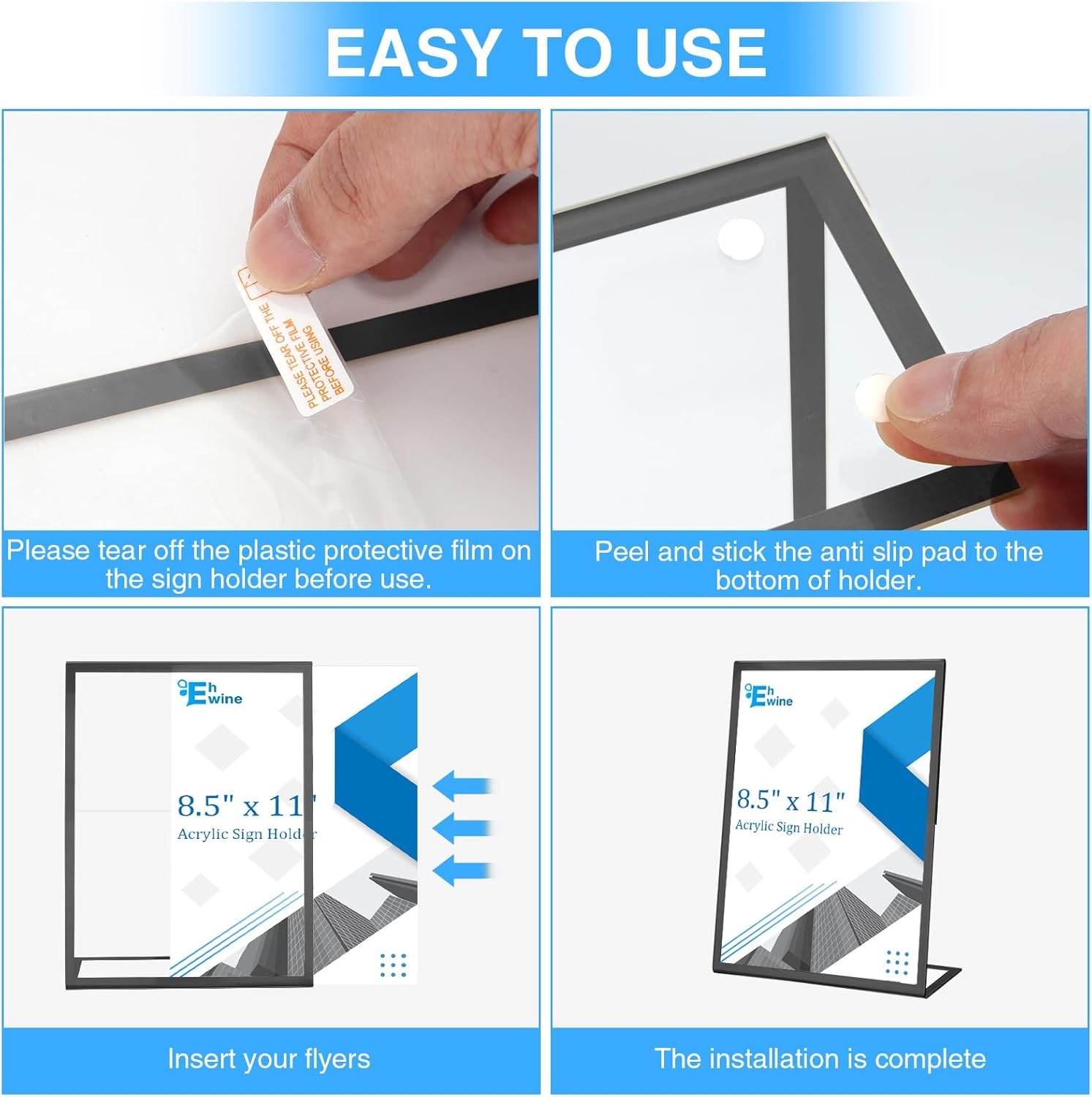- Easy to Use: Insert 4 anti-slip pads into the base, Each of our Acrylic Sign Holder comes with a peel off film guide, follow the red arrows to peel off the film in seconds, and the plastic sign holder has an opening on its side for easy paper insertion