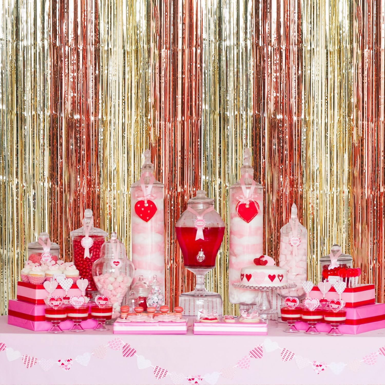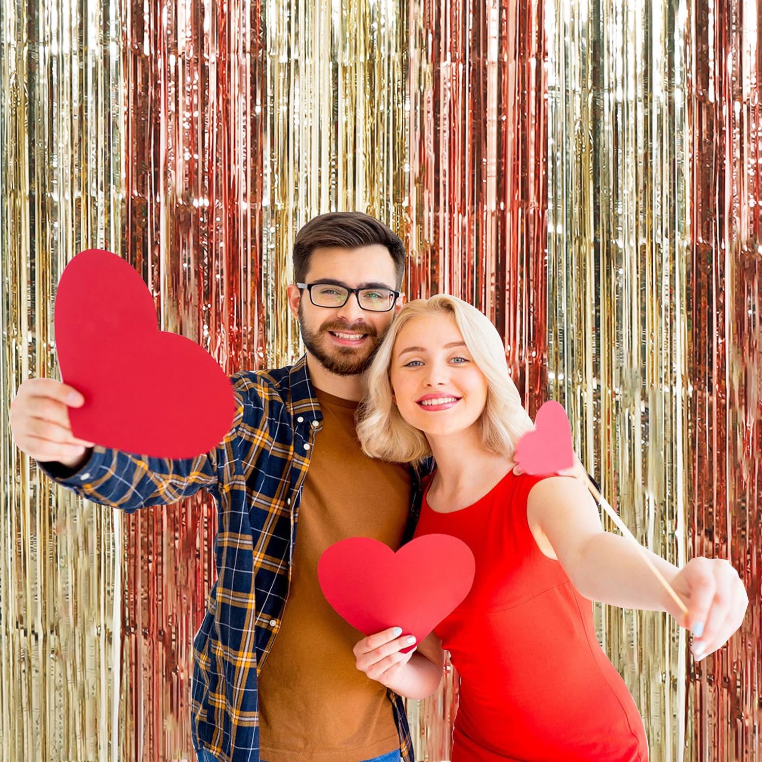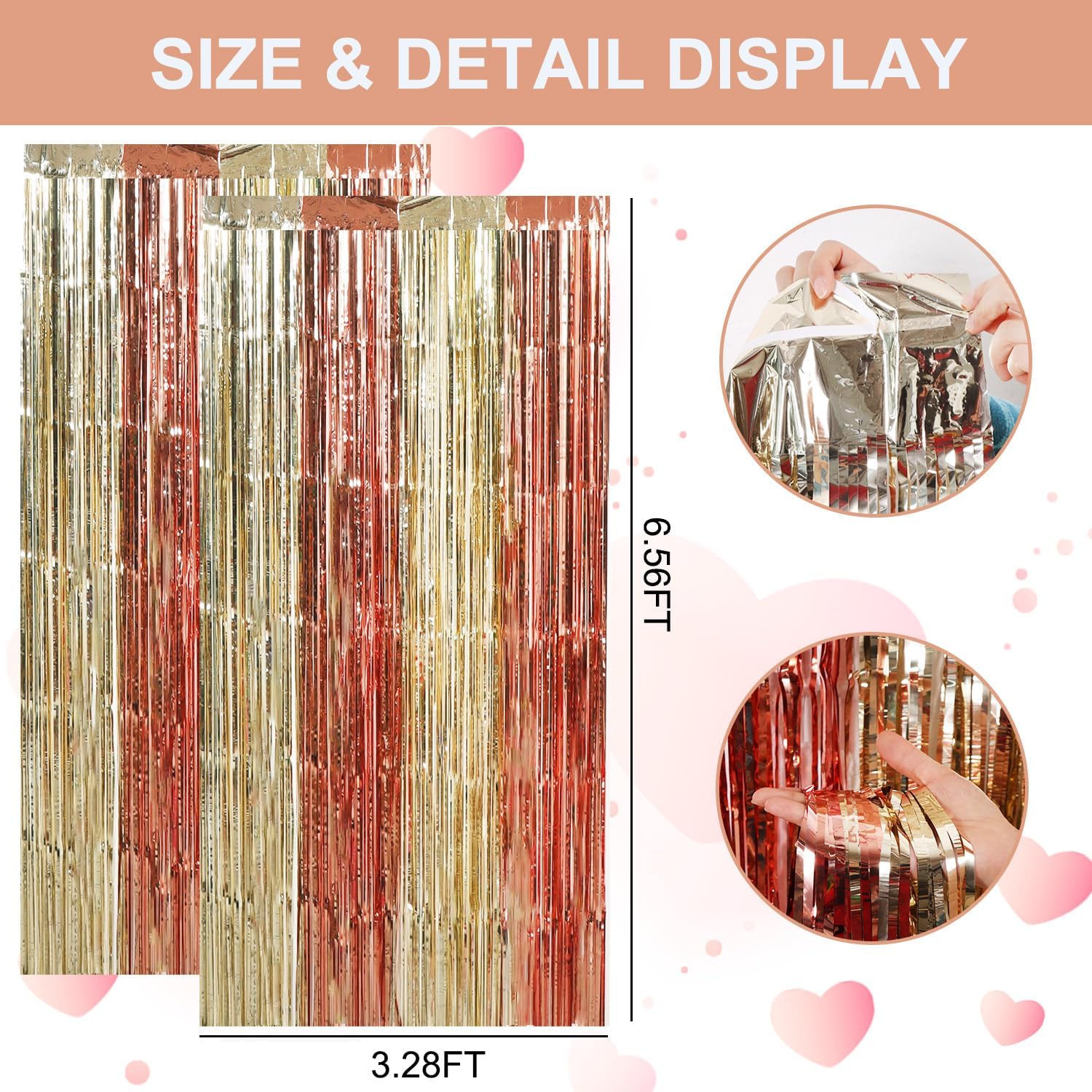 - PACKAGE CONTENTS: 2 x foil curtains: Big size (wide x drop):3.3 x 6.6 feet,6.6ft x 6.6ft in total. Brightly colored quality party decoration photography curtains will surely make you rValentine's Day party more fun.