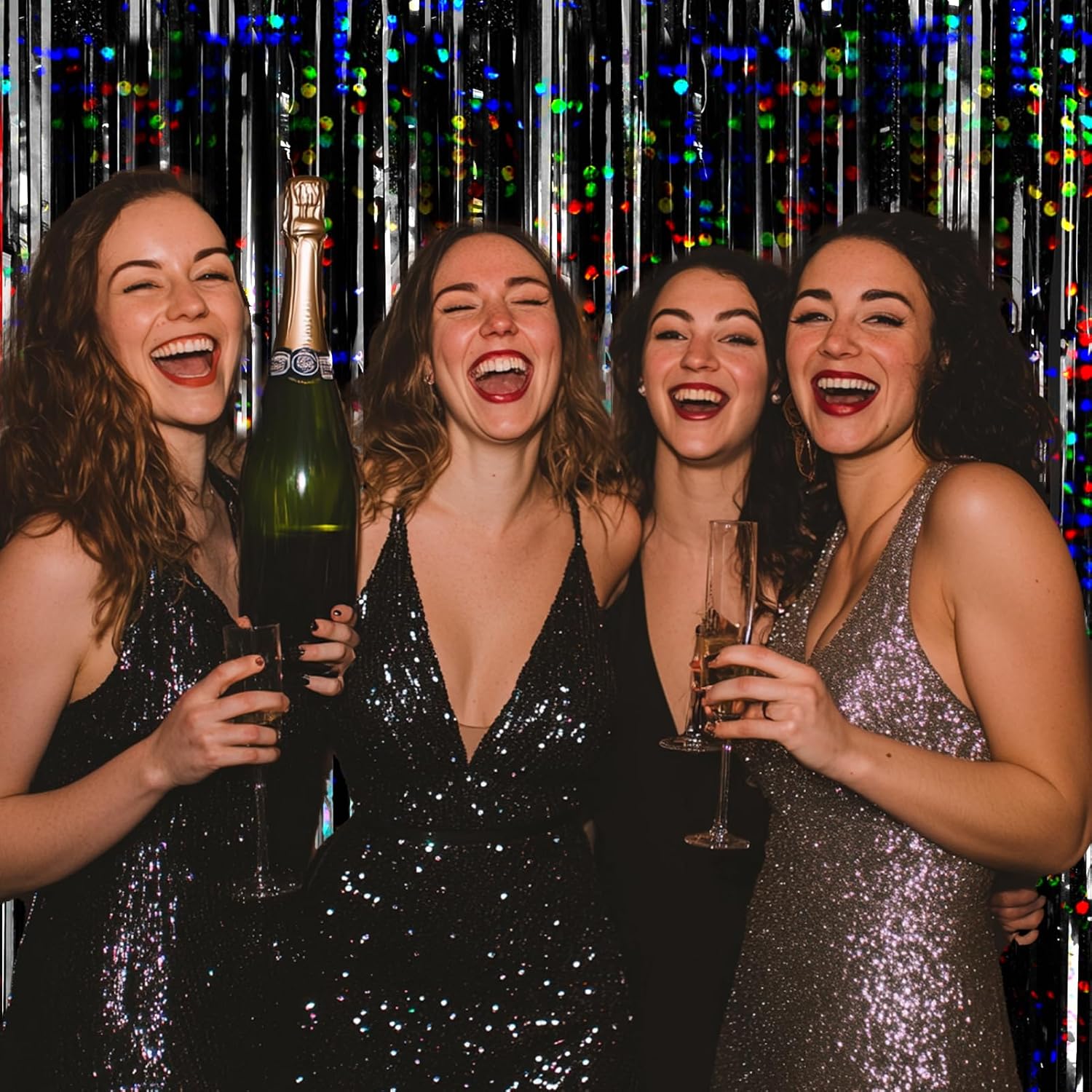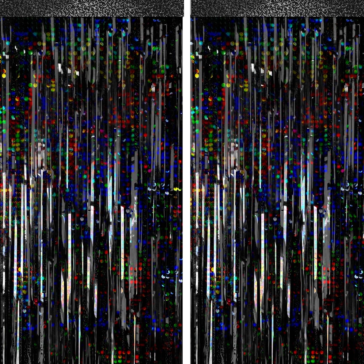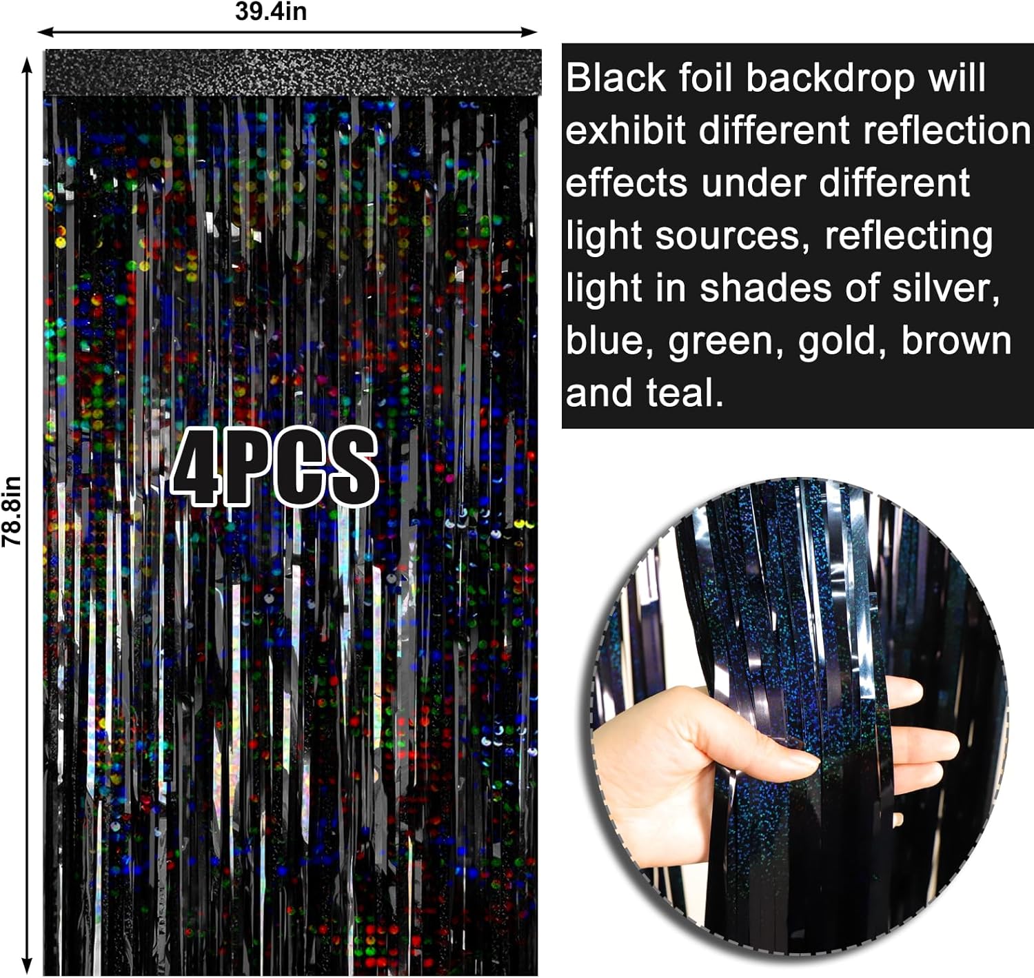 - Shimmery Fringe Backdrop: You will receive 4 pieces black tinsel backdrop, each pack curtains size is 3.3ft x 6.6ft, enough length for decorate your party. These foil backdrop curtains are perfect for the door or wall to create an impressive decoration for parties, events, and photo booths.