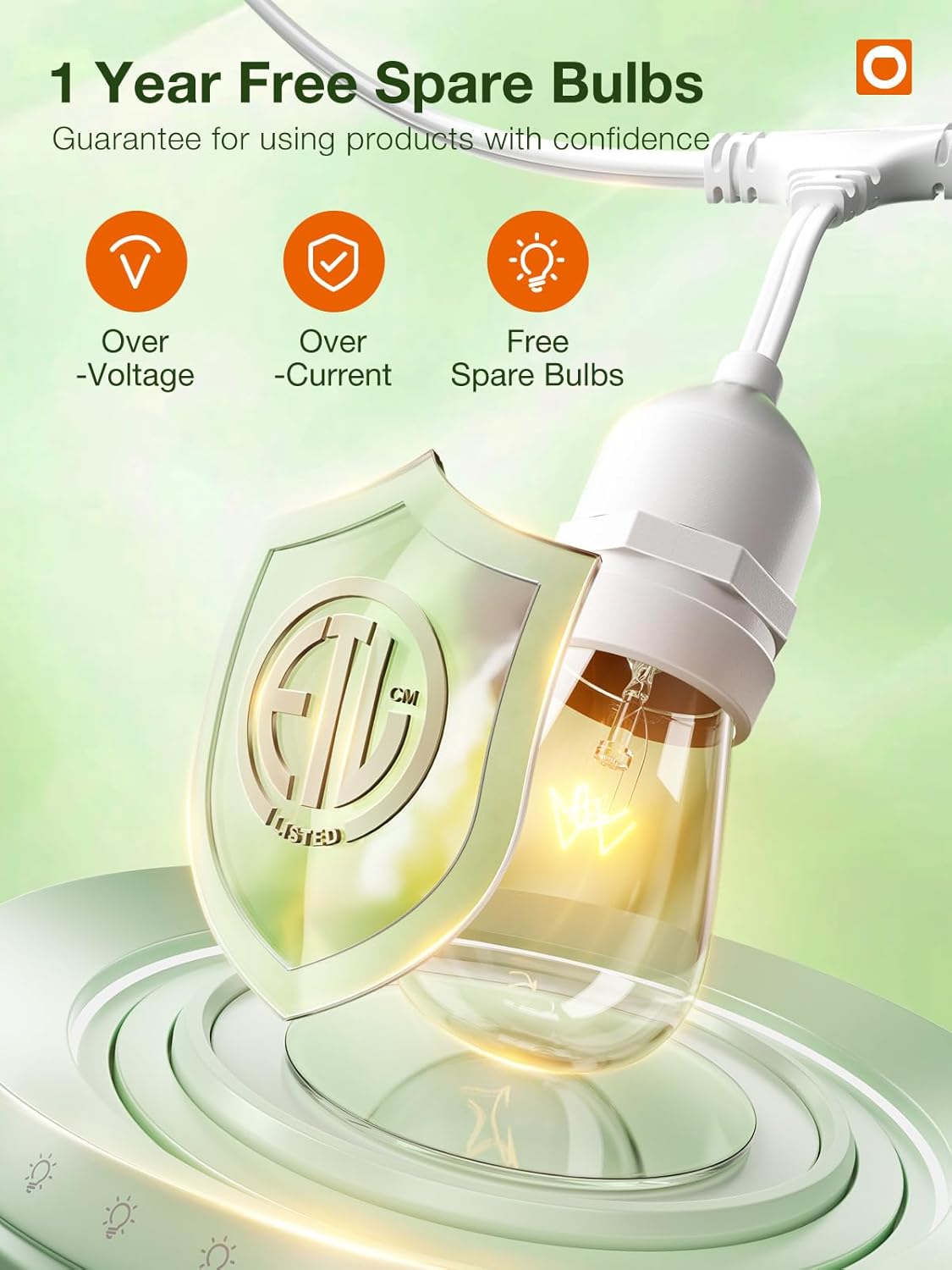 - Ideal Outdoor Lighting: It will come with 2 strands of 48FT string lights. Each strand contains 15 hanging sockets and 3 spare bulbs, provided with 18 5W S14 incandescent bulbs. The distance between bulbs is approximately 3.11FT. This heavy-duty light is bright enough and ideal illumination anywhere.