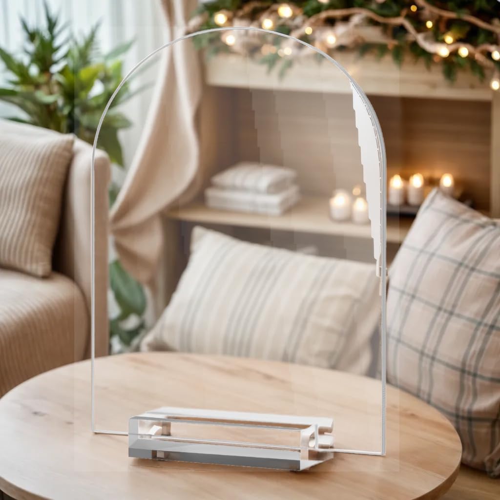 - Crystal Clear Arch Acrylic Table Sign: Crafted from high-quality clear acrylic, these blank arch acrylic signs are precision-cut using laser technology, ensuring clean lines and polished smooth edges. The acrylic surface is protected by a film, making it resistant to scratches.