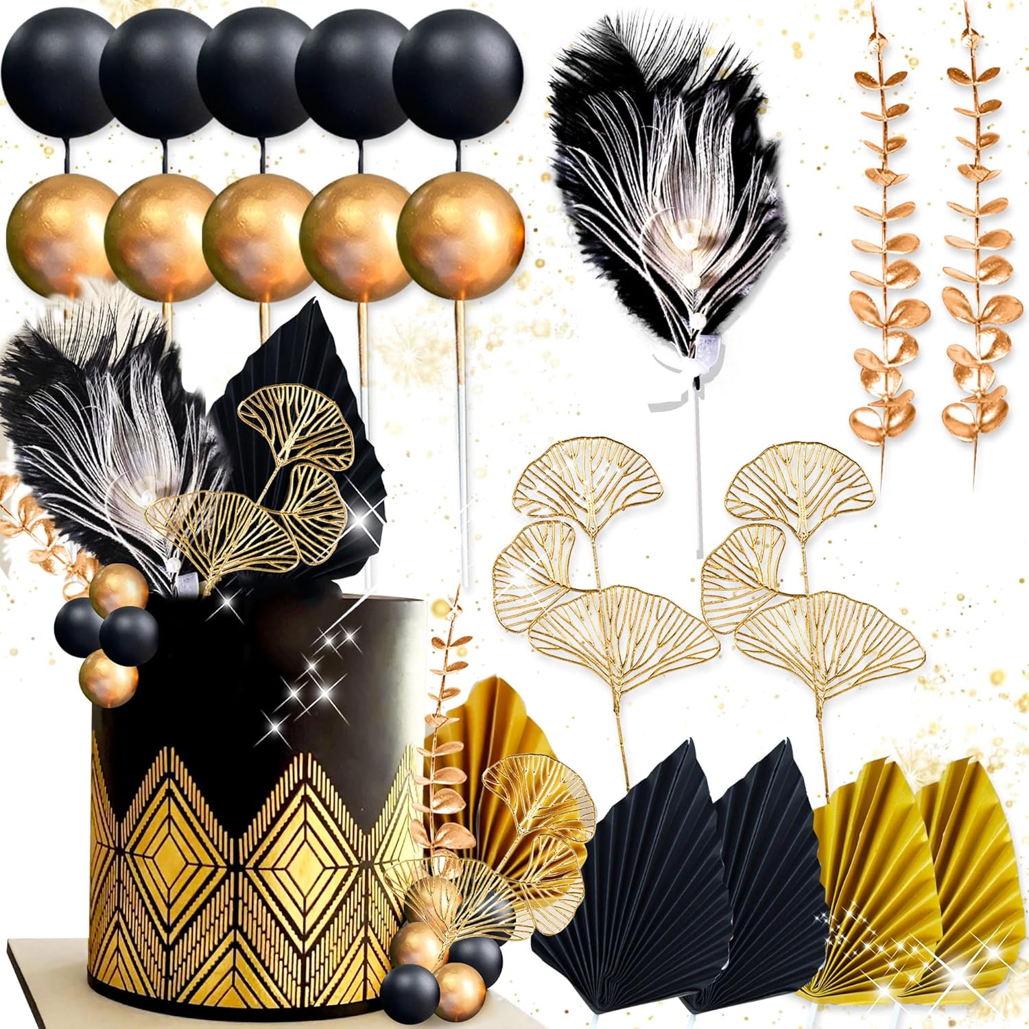- You will get: 1 x Feather Cake Topper, 5 x Gold Cake Balls, 5 x Black Cake Balls, 4 x Two Different Leaves, 2 x Black Folding Fans, 2 x Gold Folding Fans. The size is as shown in the picture, this is a perfect set of cake toppers for your DIY needs!