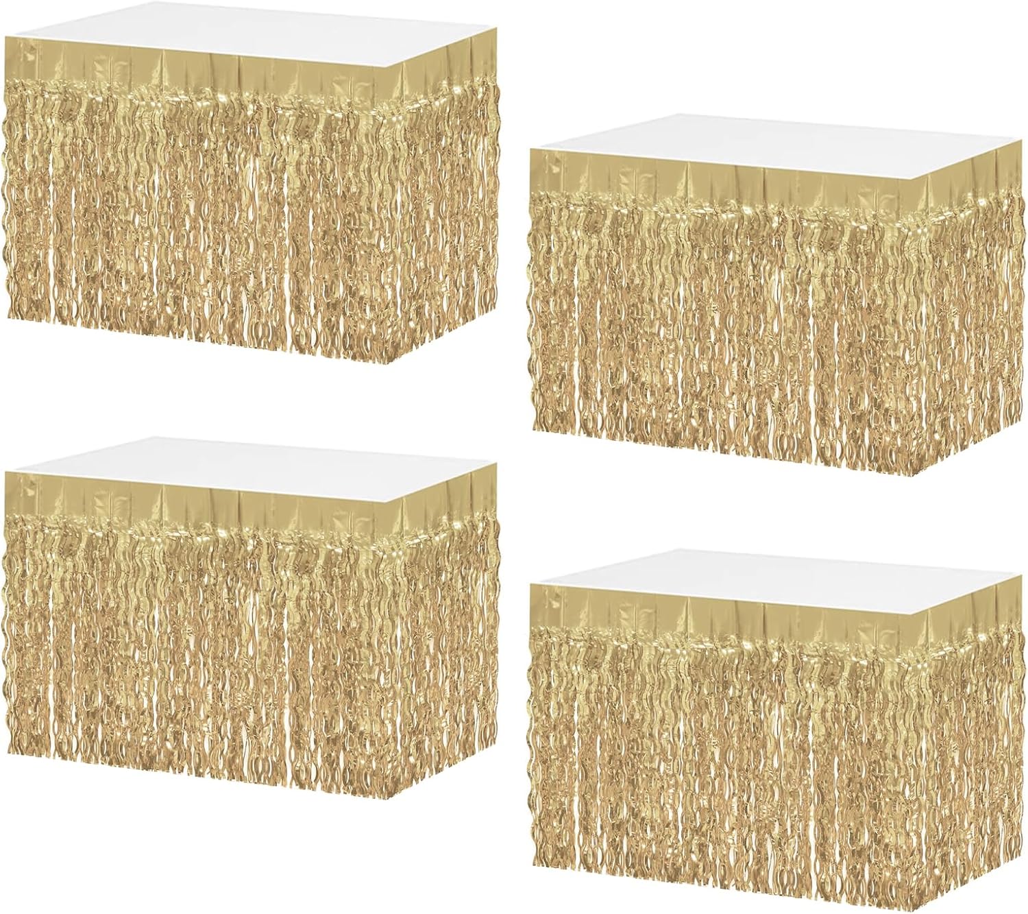 - 【 Material】 4 Pack Wavy Foil Fringe Tinsel Table Skirt: 30in x 108in(W*L) made of tinsel with a shiny surface and a lightweight durable metallic fringe skirt, not easy to wrinkle or tear. Please confirm the size your need before buying.