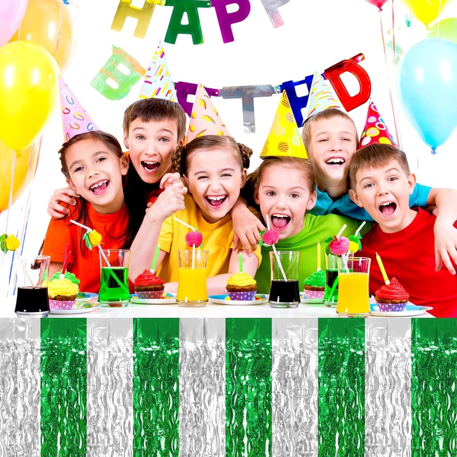 4P Wavy Metallic Tinsel Foil Fringe Table Skirts for Rectangle Tables Backdrop Garland Curtains for Parade Floats Wedding Birthday Parties Decoration Graduation 2025 Christmas (Silver Green)