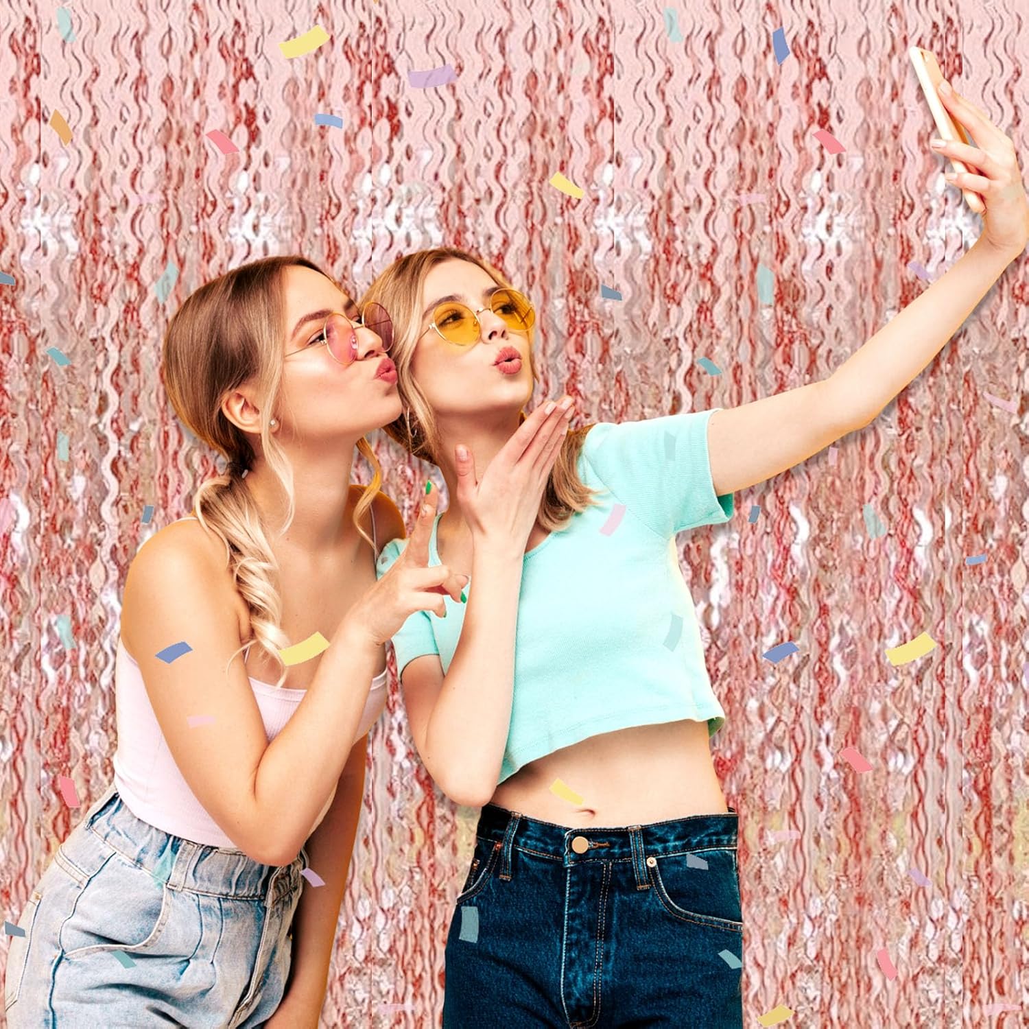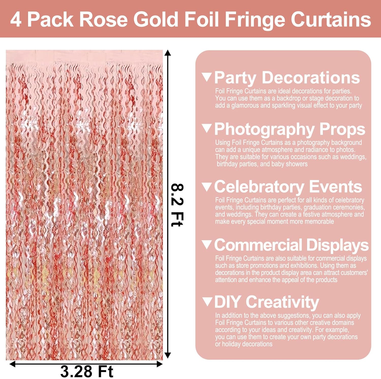 4 Pack Rose Gold Wave Foil Fringe Curtain Backdrop, 3.28Ft x 8.2Ft Metallic Tinsel Foil Fringe Streamer Curtains for Photo Booth, Mother's Day, Easter, Birthday, Wedding Party Decoration