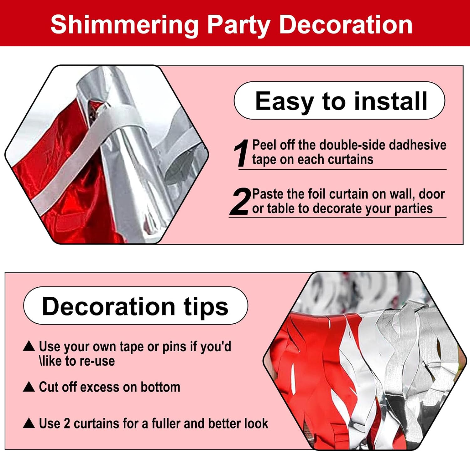 - Easy To Assemble | Strong Adhesive | Not Easy Fade : The foil fringe curtain backdrop party decorations come with double-sided adhesive tape, easy to use, just tear off the back of adhesive tape, then paste this streamers backdrop curtains on the top of wall, window, table, or as door fringe decoration.