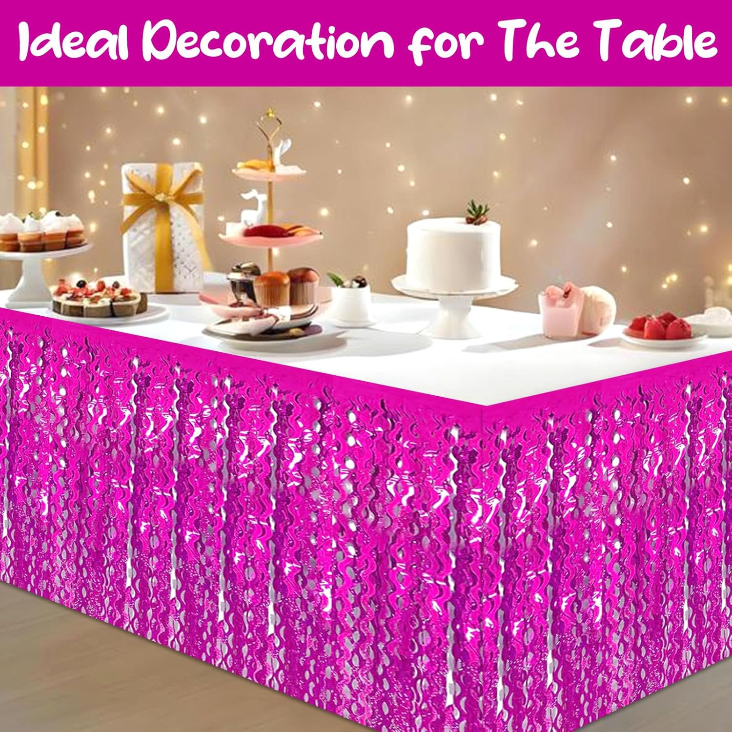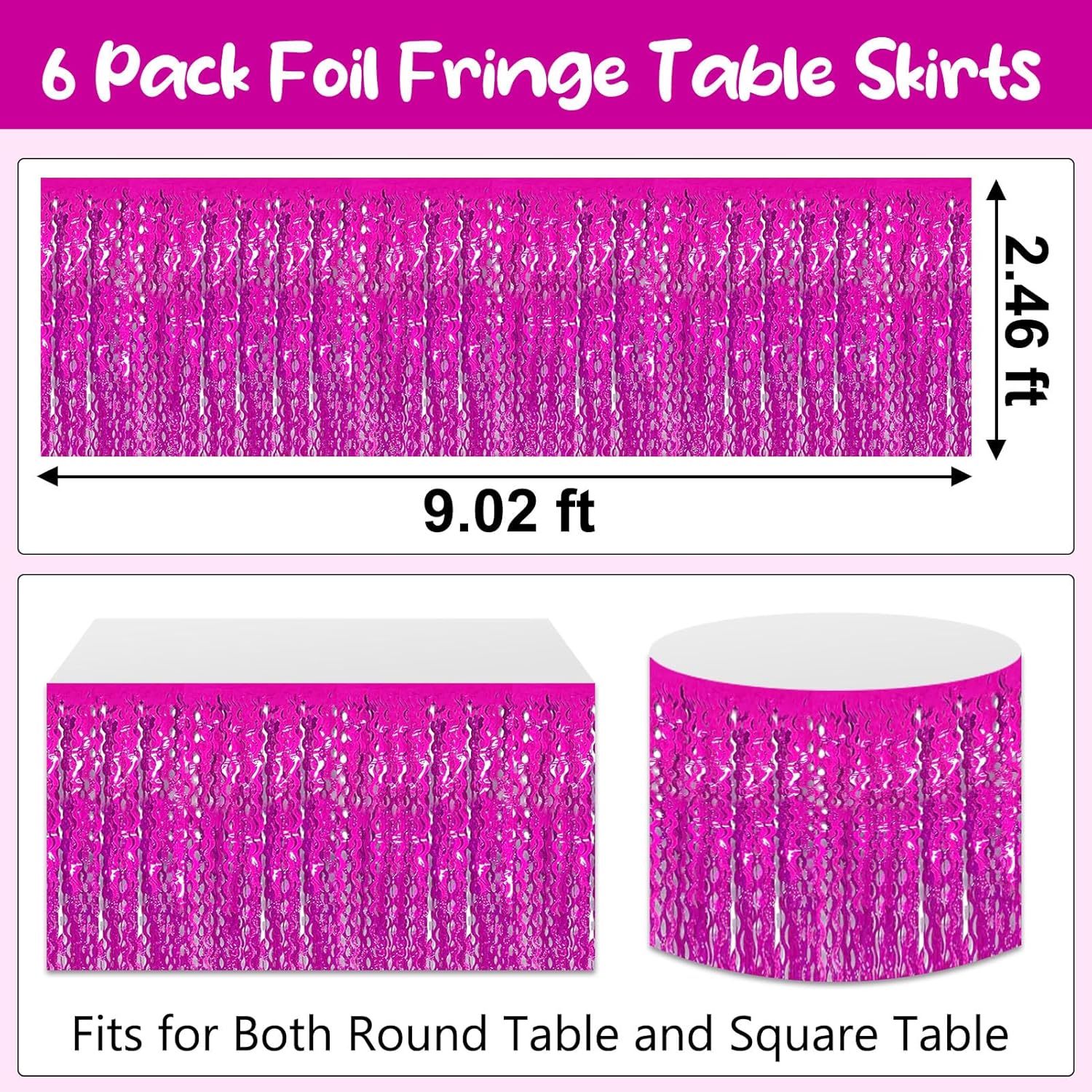 - Specifications and dimensions:6 Packs metallic foil tassel table skirt 29x108 inches, which is enough to decorate your party, provide you with excellent Convenient installation: the table skirt is equipped with self-adhesive tape. Just tear off the tape and paste it. The installation is convenient and quick. It can be pasted on the edge of your round table and square table. It can be easily cut into any siz.