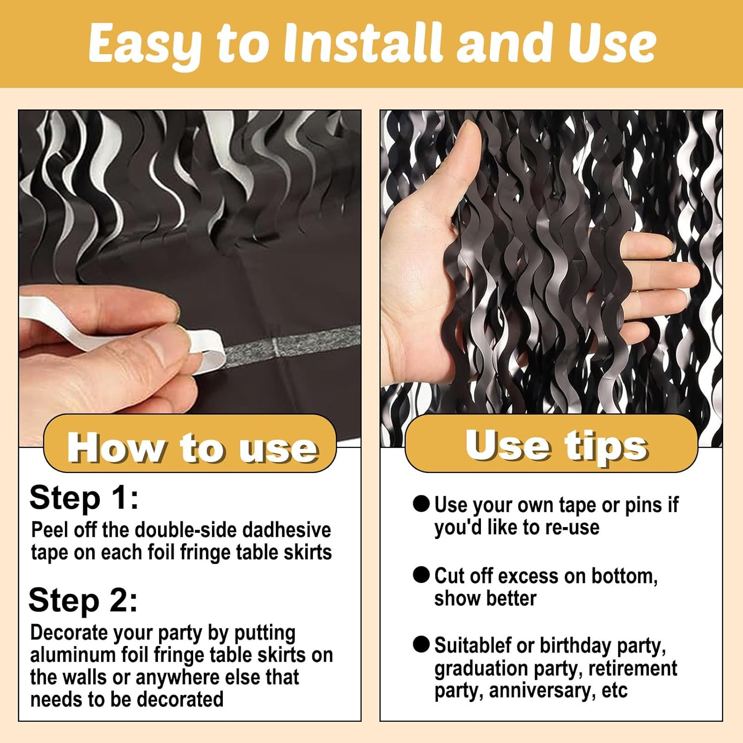 6 Pack 29x108 Inch Black Wave Foil Fringe Table Skirts Metallic Banner for Tinsel Streamer Garland Backdrop for Parade Floats Wedding, Mother's Day, Birthday Mardi Gras Party Decorations
