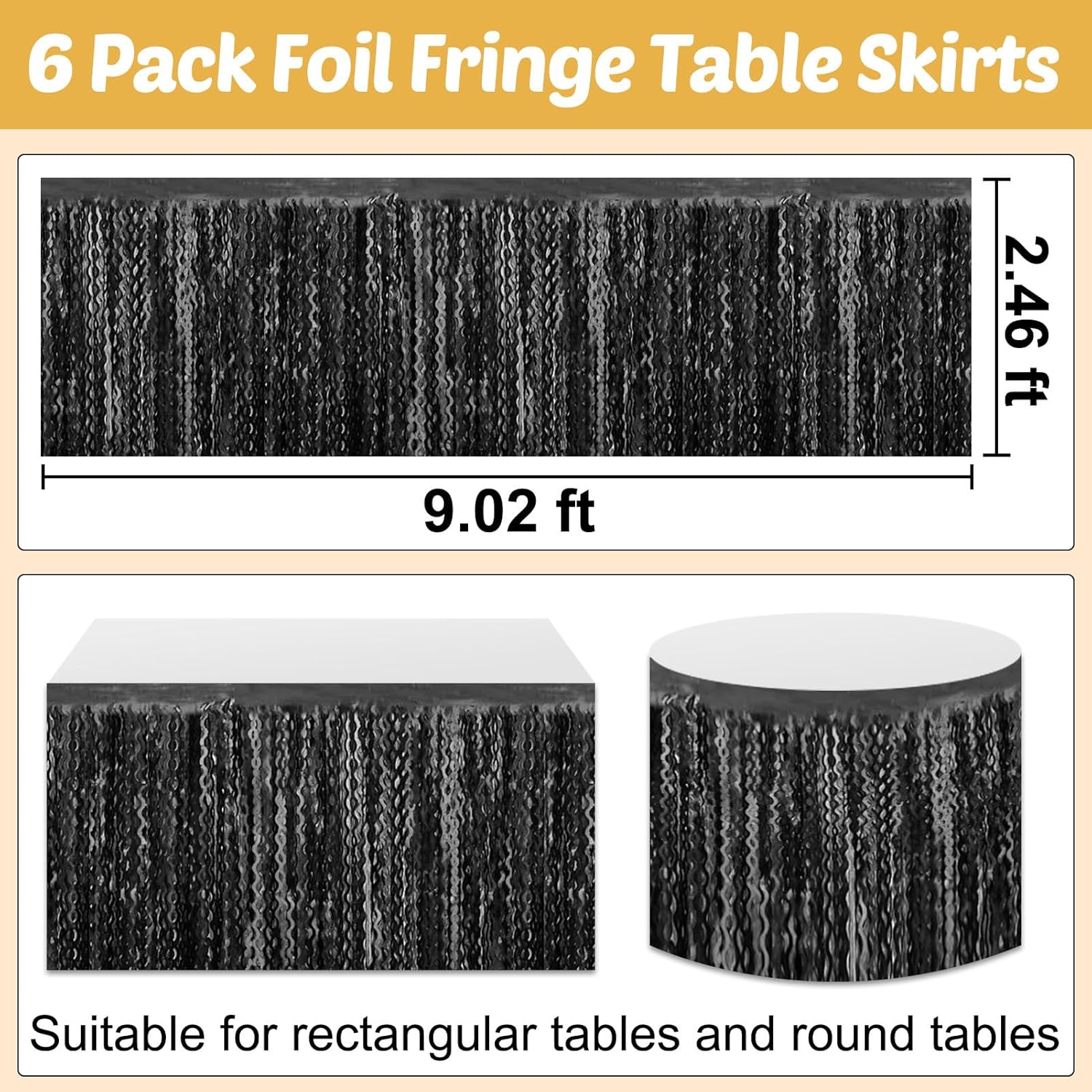 - Package Includes: 6pcs/set metallic fringe table skirts / shiny tassel banner, beautiful and shiny, provide you with great decoration effects, Each pack of table skirt measures 29x108 inches. Each one will be 9 Ft long, 6 pack will cover 54 FT length of tables.