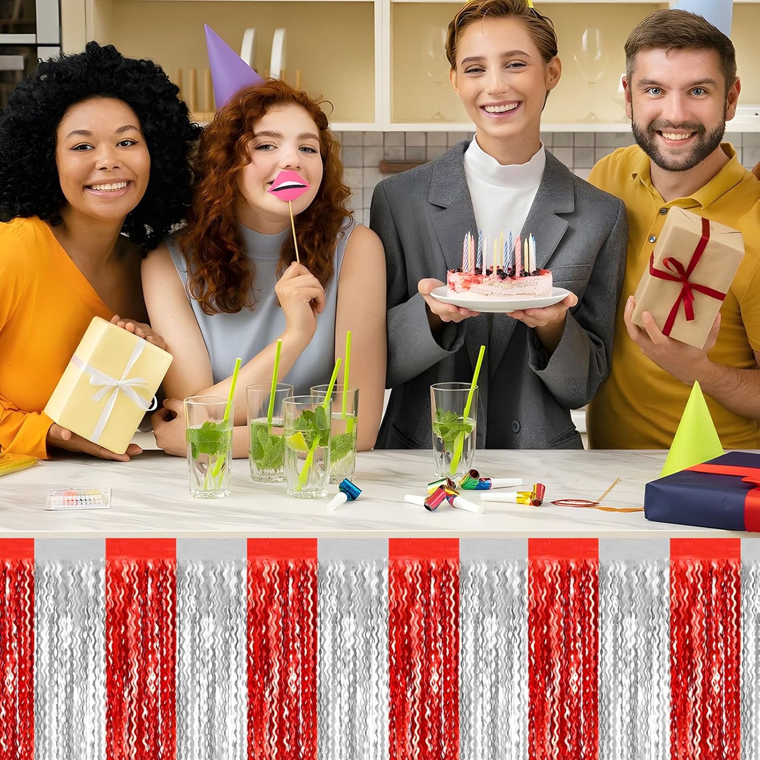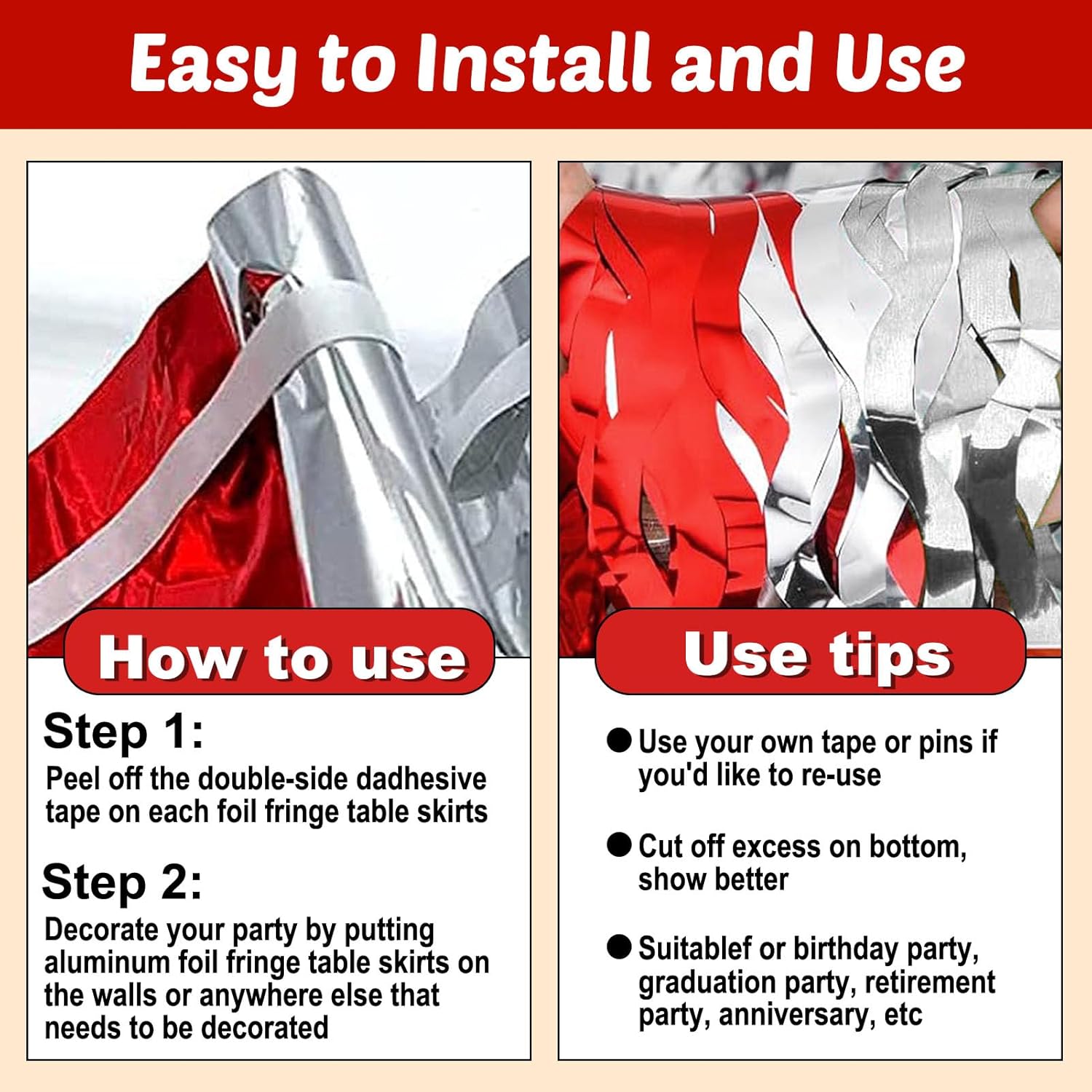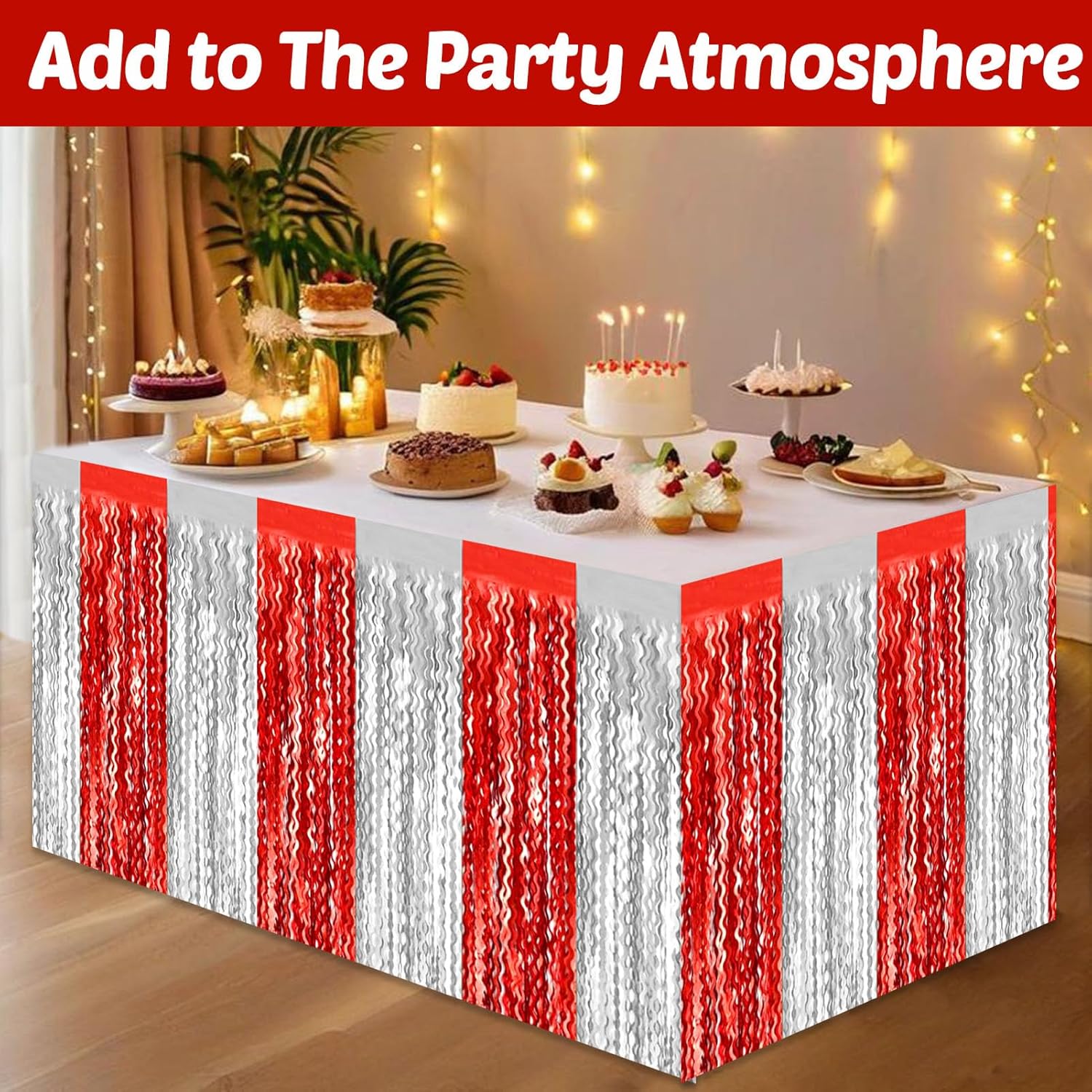 6 Pack 29x108 Inch Red Silver Wave Foil Fringe Table Skirts Metallic Banner for Tinsel Streamer Garland Backdrop for Parade Floats Wedding, Mother's Day, Birthday Mardi Gras Party Decorations
