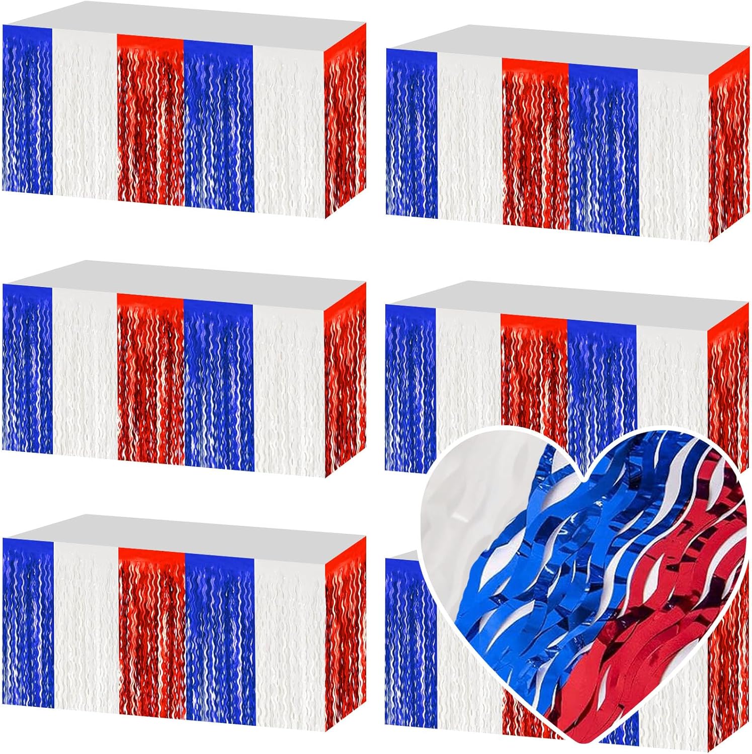 6 Pack 29x108 Inch White Blue Red Wave Foil Fringe Table Skirts Metallic Banner for Tinsel Streamer Garland Backdrop for Parade Floats Wedding, Mother's Day, Birthday Mardi Gras Party Decorations
