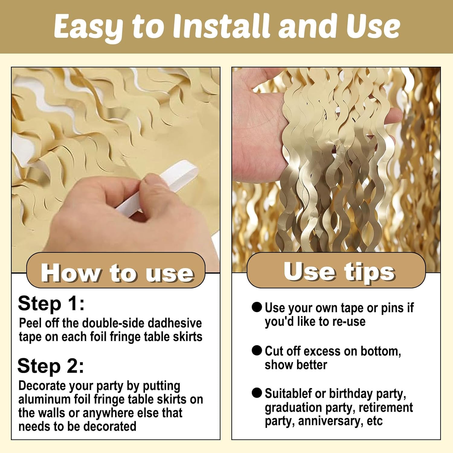 6 Pack 29x108 Inch Champagne Gold Wave Foil Fringe Table Skirts Metallic Banner for Tinsel Streamer Garland Backdrop for Parade Floats Wedding, Mother's Day, Birthday Mardi Gras Party Decorations