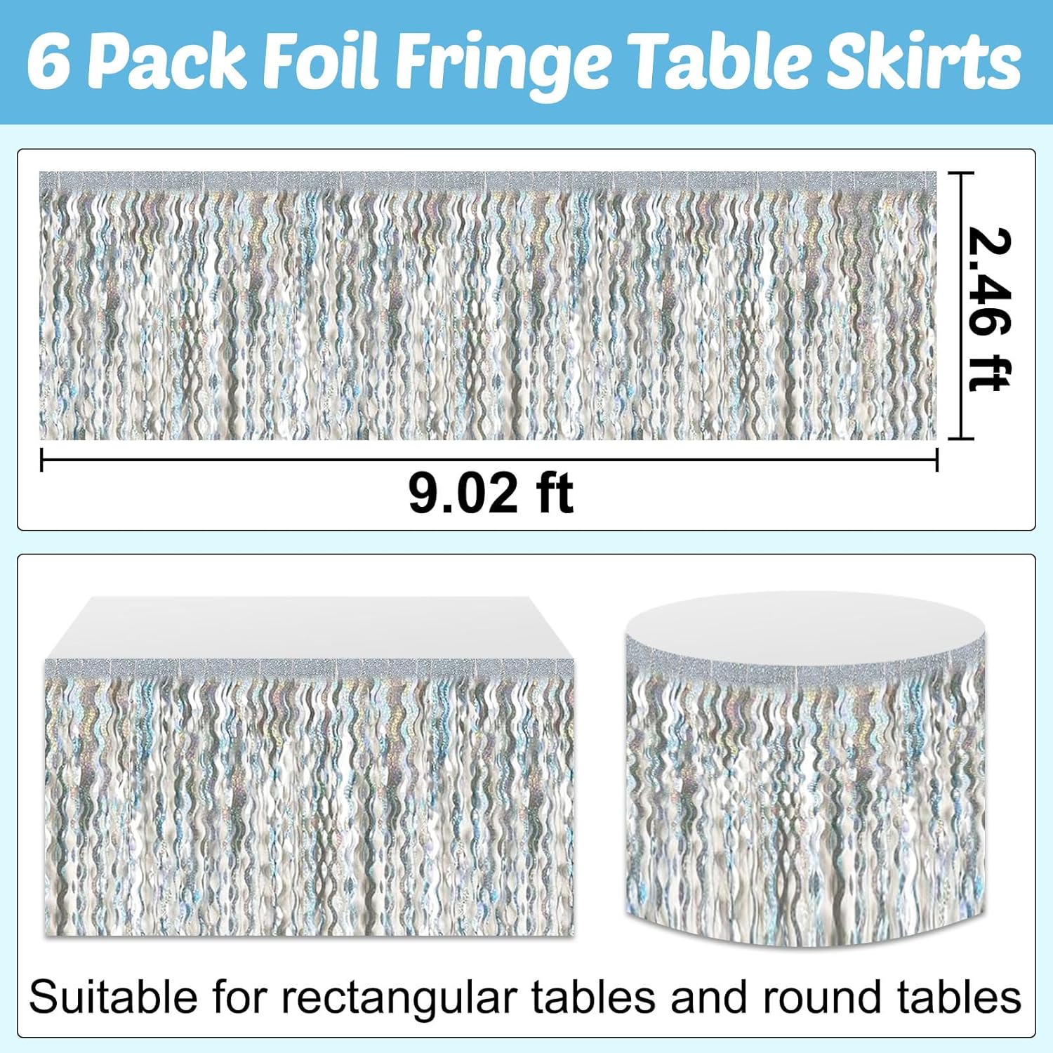 6 Pack 29x108 Inch Silver Wave Foil Fringe Table Skirts Metallic Banner for Tinsel Streamer Garland Backdrop for Parade Floats Mother's, Graduate, Mardi Gras, Birthday, Wedding Party Decorations