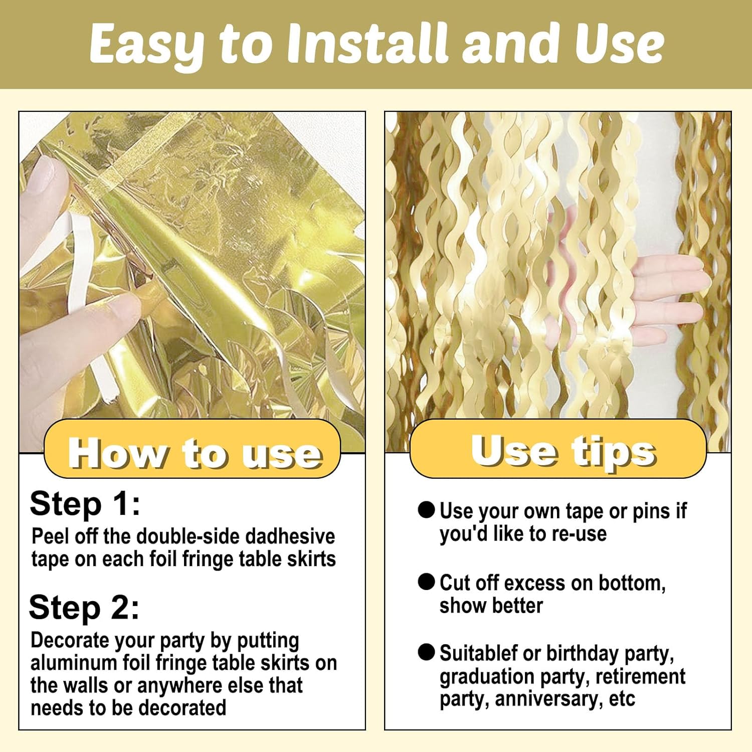 - Beautiful decoration: you can use these tinsel fringe table skirt to decorate a classroom, the stage for school program, a homecoming float, a wedding decoration, birthday party, Disco party, baby shower, halloween, christmas, new year's eve, bachelorette party, anniversary Memorial, Hollywood Party, independence Day, Carnival Party, Bridal Shower, Graduation and more.