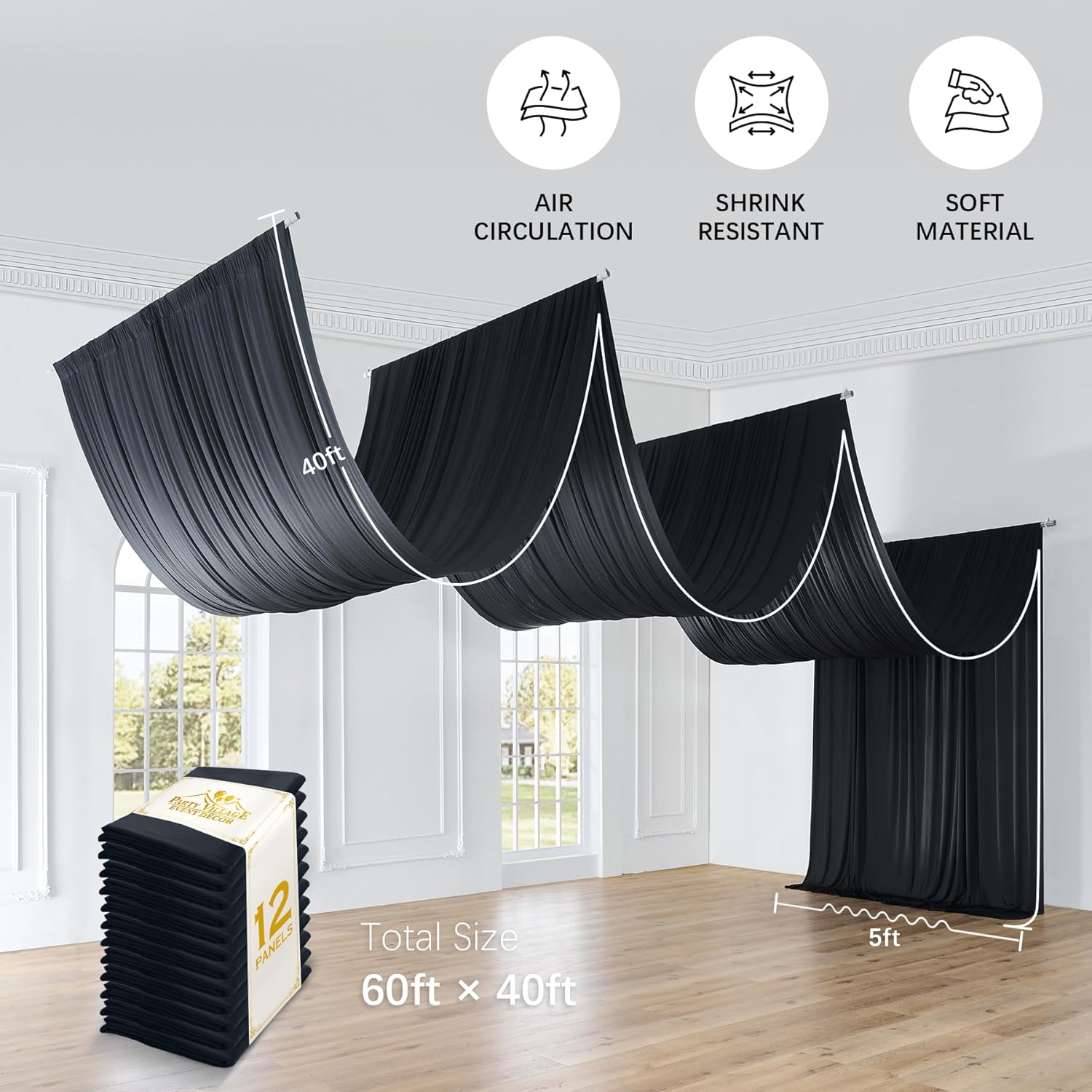 - 40ft Extra Long Ceiling Drapes: 12 Panels 5ftx40ft Black Backdrop Curtains for Parties. Totally 60FT(Width) x 40FT(Height). cortinas para fiestas decoracion.
