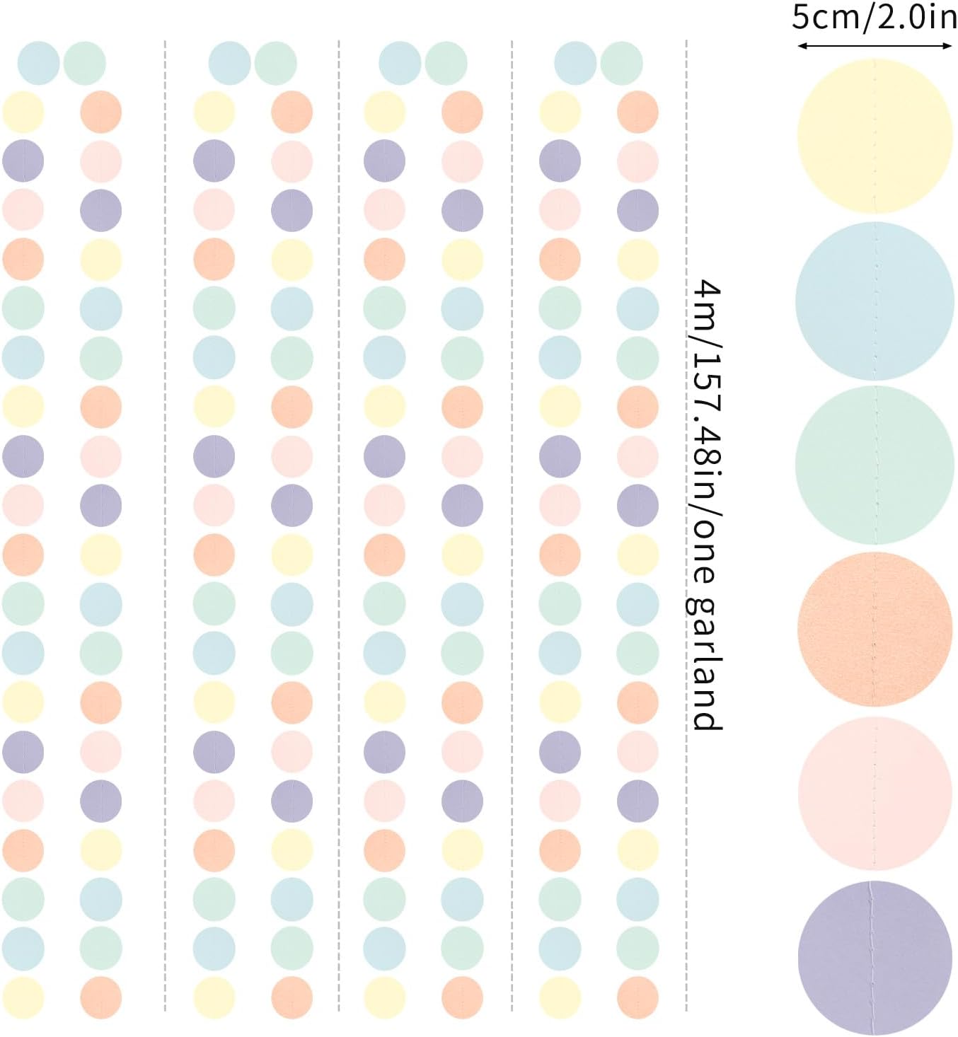 - PACKAGE CONTAINS: This set has four pastel rainbow paper circle garland,the length of each strand is 4 meters/13.1 feet, the total length is 16 meters/52.5 feet.The size is 2IN.