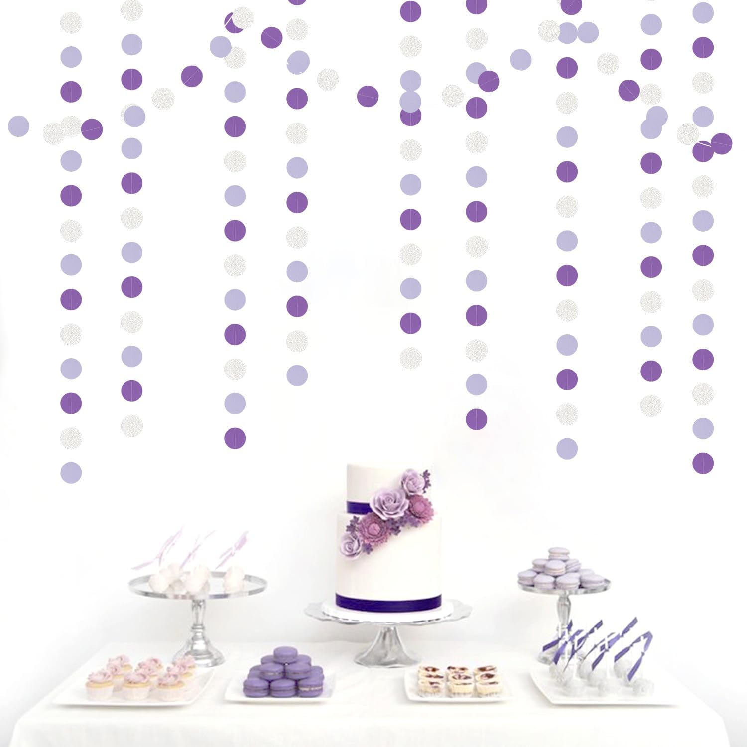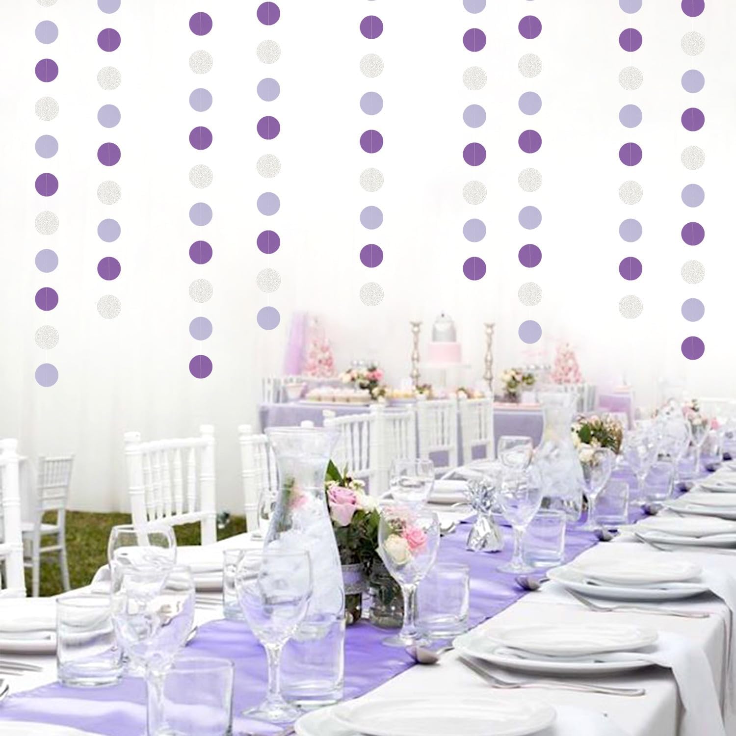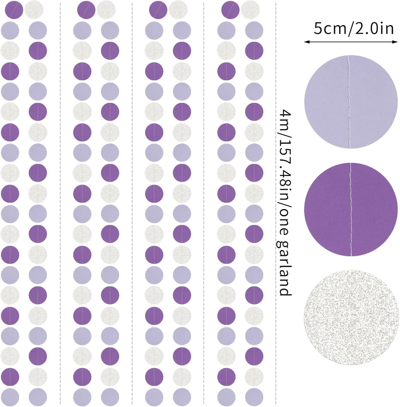 - PACKAGE CONTAINS: This set has four purple silver paper circle garland,the length of each strand is 4 meters/13.1 feet, the total length is 16 meters/52.5 feet.The size is 2IN.