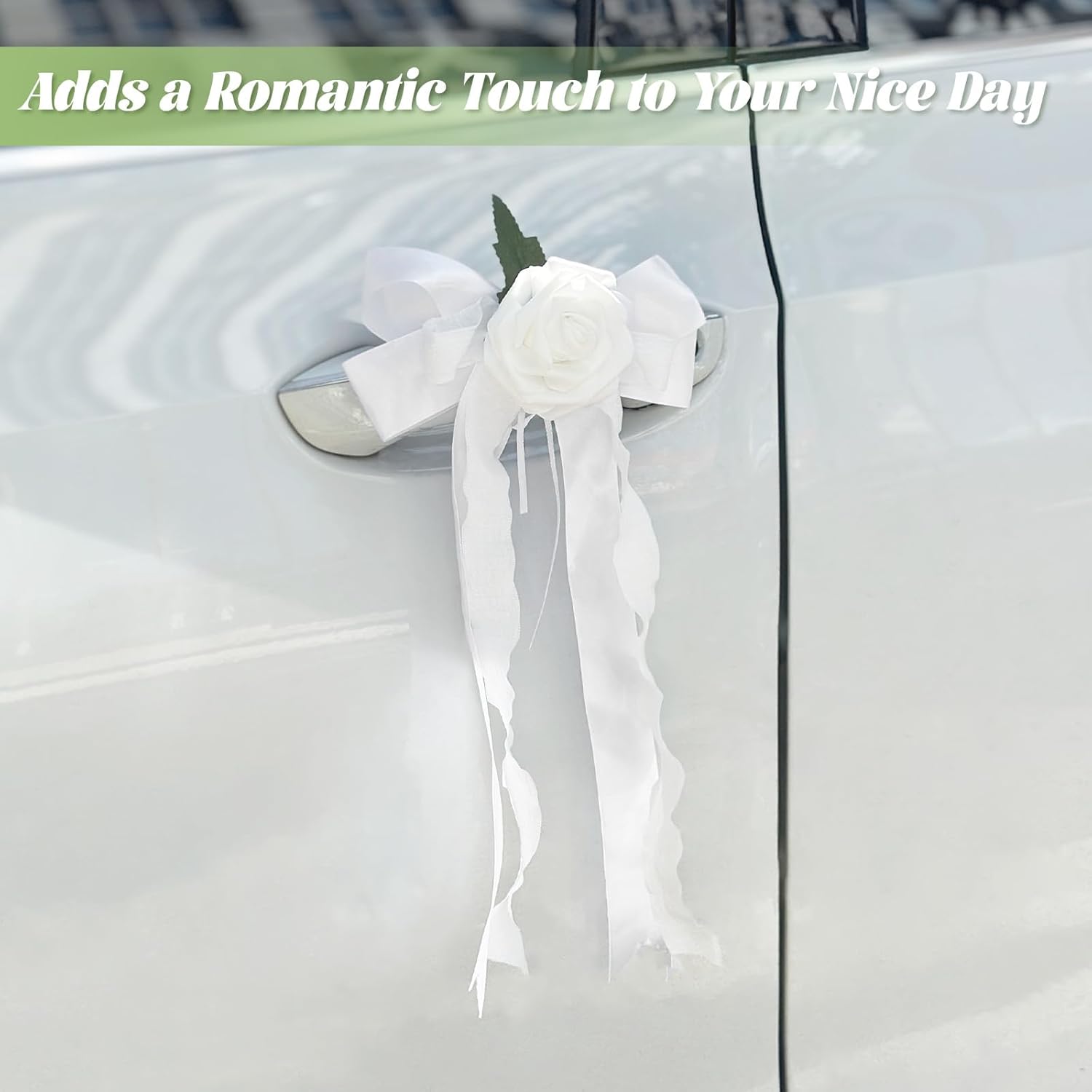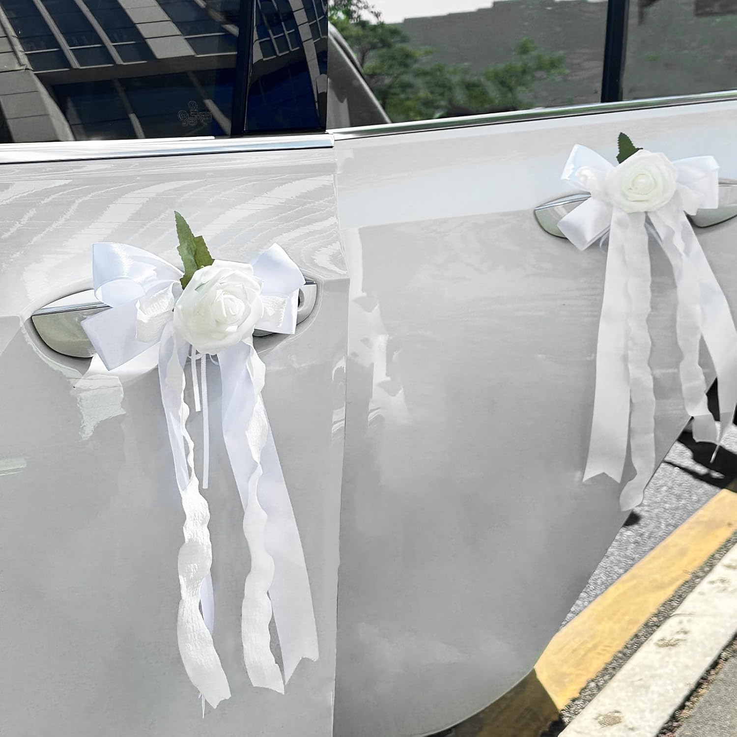 6PCS Wedding Car Door Handle Flowers, White Artificial Cars Rearview Mirror Bouquet Flower Bowknot Ribbon Decors, Just Married Automotive Decoration Accessories for Door Handles and Rearview Mirrors
