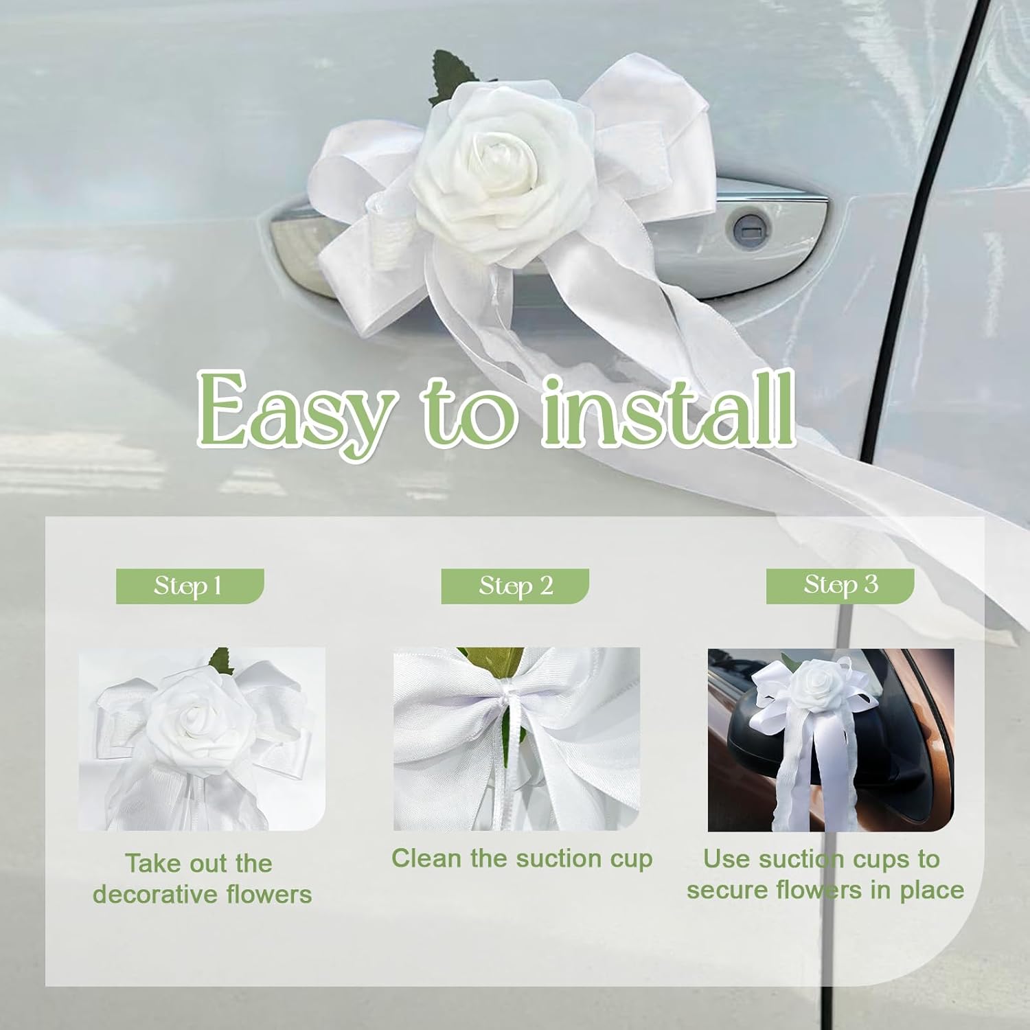 - Wedding Car Decoration Set: This set includes 6 decorative bouguet flowers car ribbon decorations, designed for car door handles and rearview mirrors. The mini bouguet flowers can your wedding car looks elegant and romantic from every angle