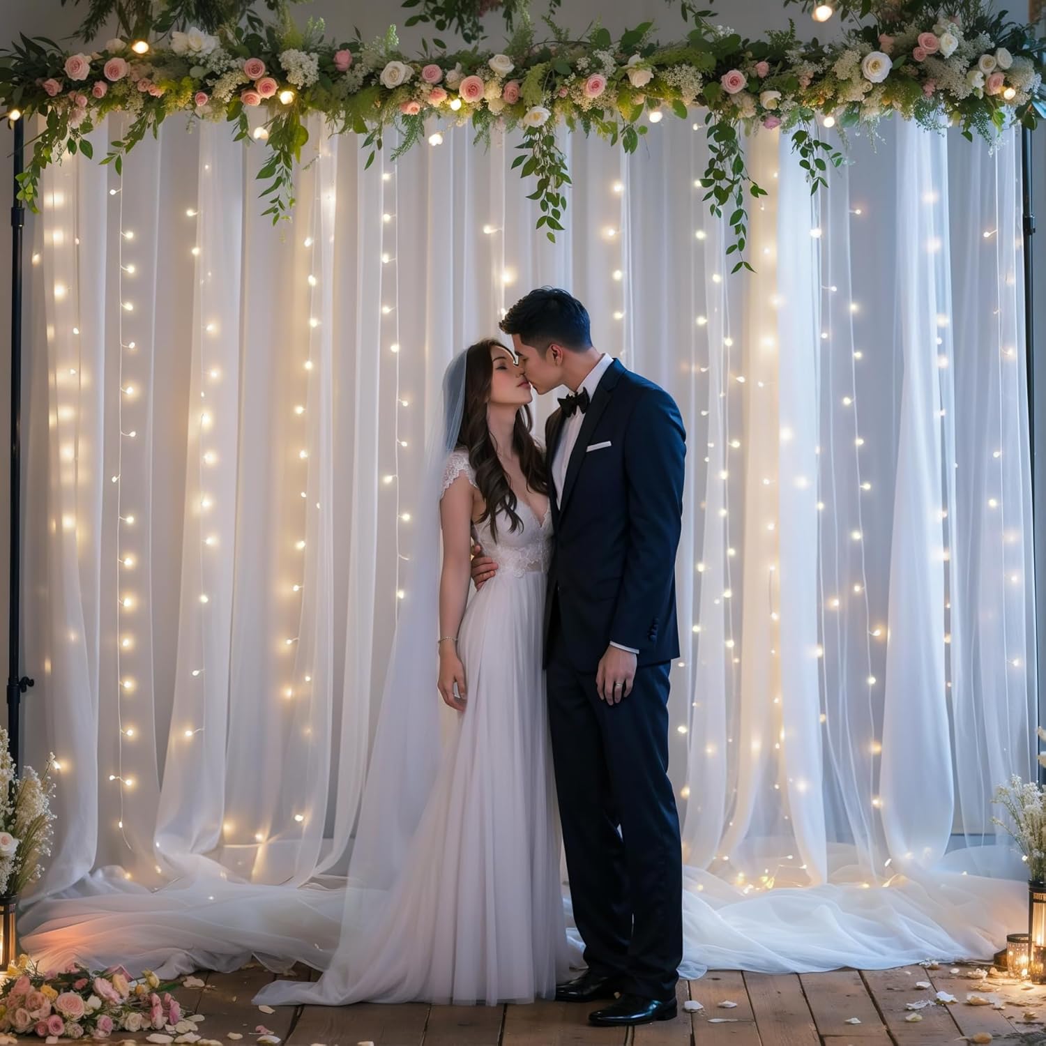 - Backdrop Curtains with Lights: Each set includes 4 pieces of 5x10ft white sheer tulle backdrop curtains, 2 sets of 10 ft warm white LED string lights, and 24 clips. These sheer curtains with lights are perfect for wedding photo booths or wedding reception backdrops, bringing a romantic and charming atmosphere to evening events