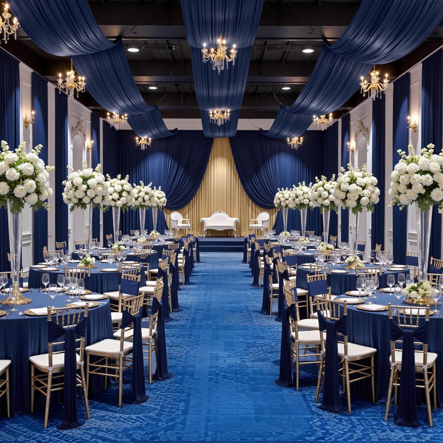 - 💐【Navy Blue Ceiling Drapes】The package will include 2 panels Navy Blue wedding drape curtain(without hanging pieces), each wedding extra long curtain measures 5 feet (60inch)wide x30 feet(360inch) long.The sufficient quantity can meet your demands for decorating your weddings, parties, receptions, and these Navy Blue ceiling drapes will create a delicate and aesthetic sense to your wedding ceiling decoration and light up every banquet.