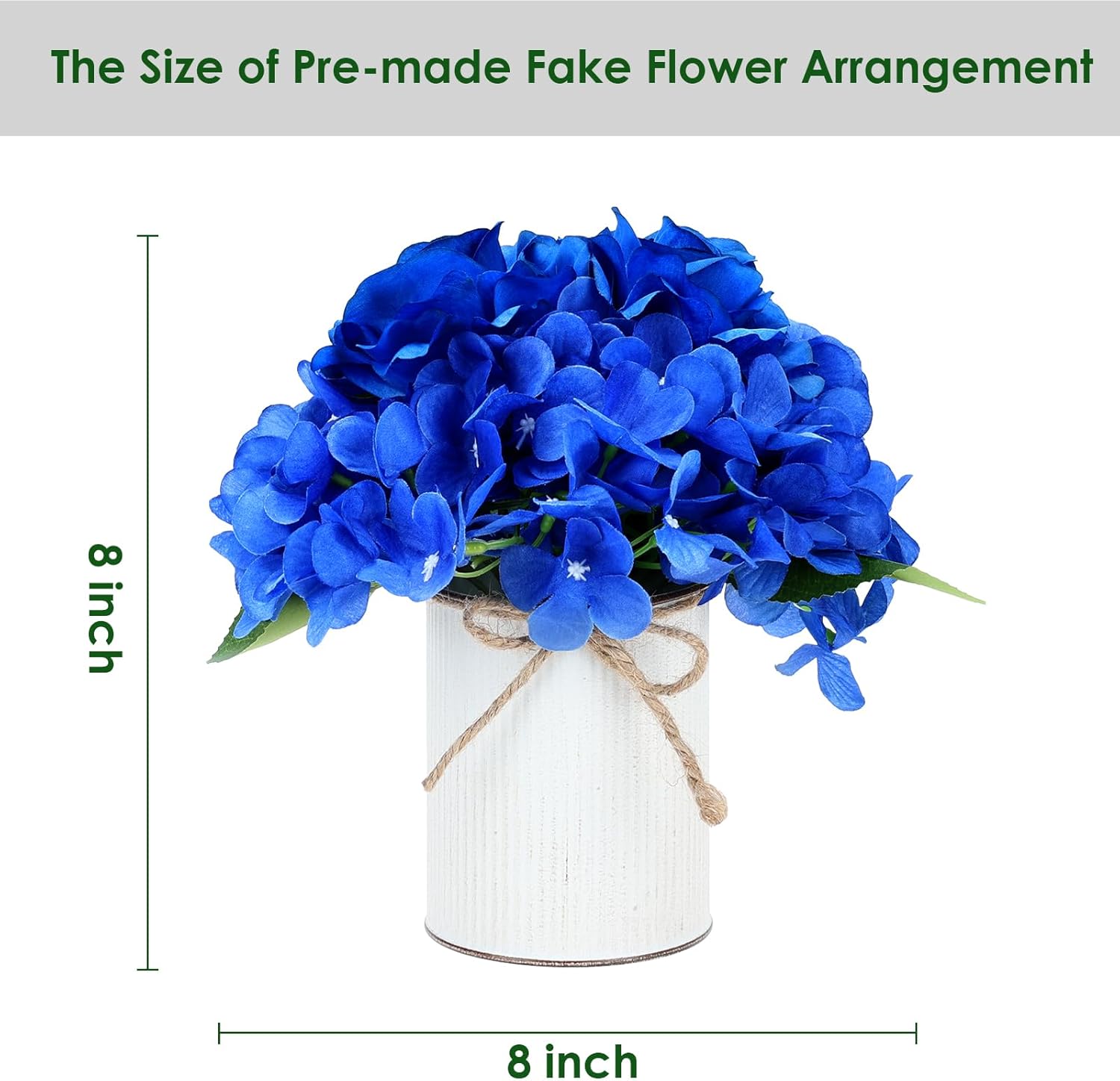 - Pack of 6 pre-made artificial flowers with rustic metal pot for table centerpieces. Consists of high quality royal blue fake roses and faux hydrangeas.