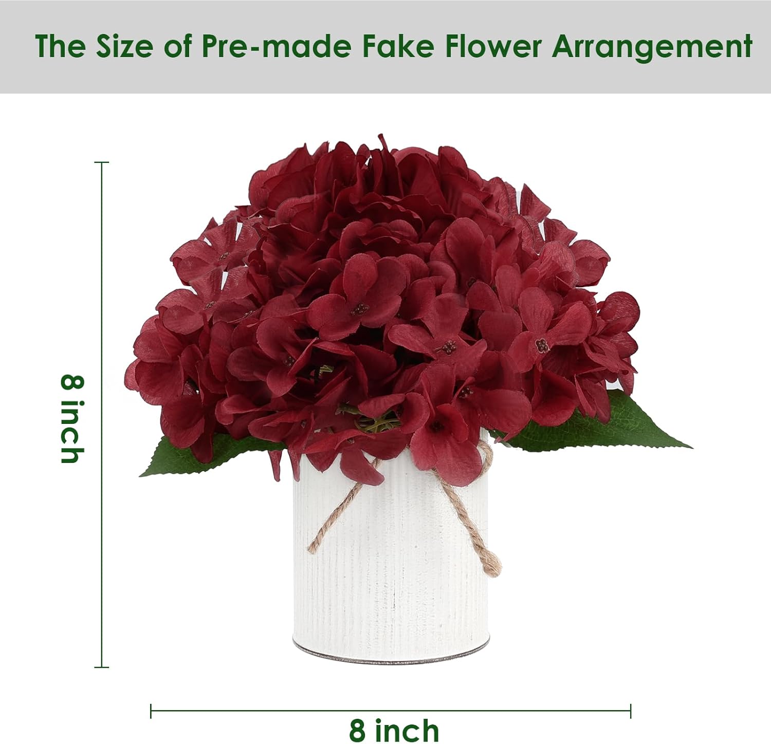 - Pack of 6 pre-made artificial flowers with rustic metal pot for table centerpieces. Consists of high quality deep red fake roses and faux hydrangeas.