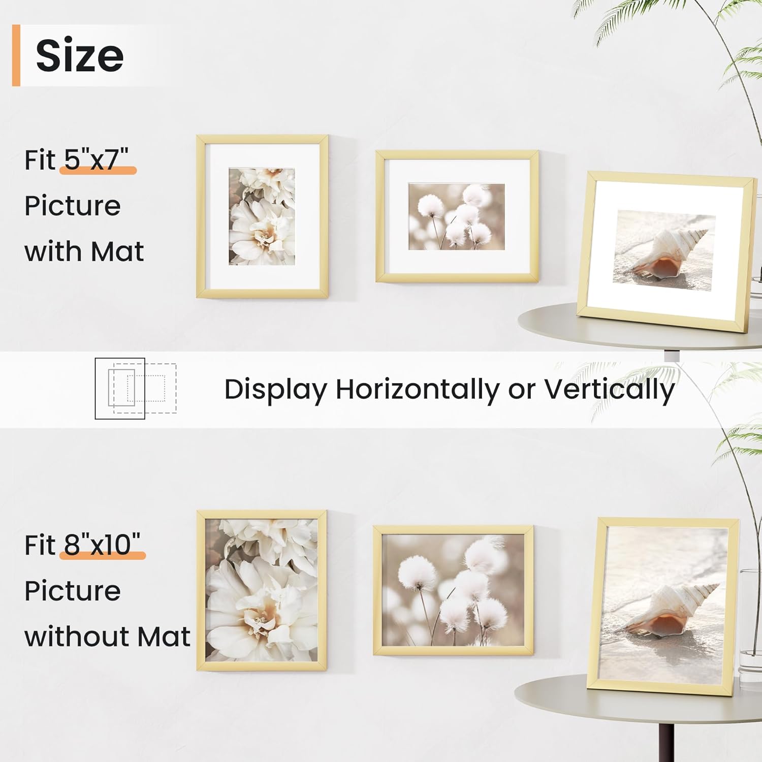 8x10 inch Picture Frame, 8x10 Photo Frames with 5x7 Removable Mat - High Definition Plexiglass - Vertical and Horizontal Display - Wall Hanging Frame - Gold, 5 Pack