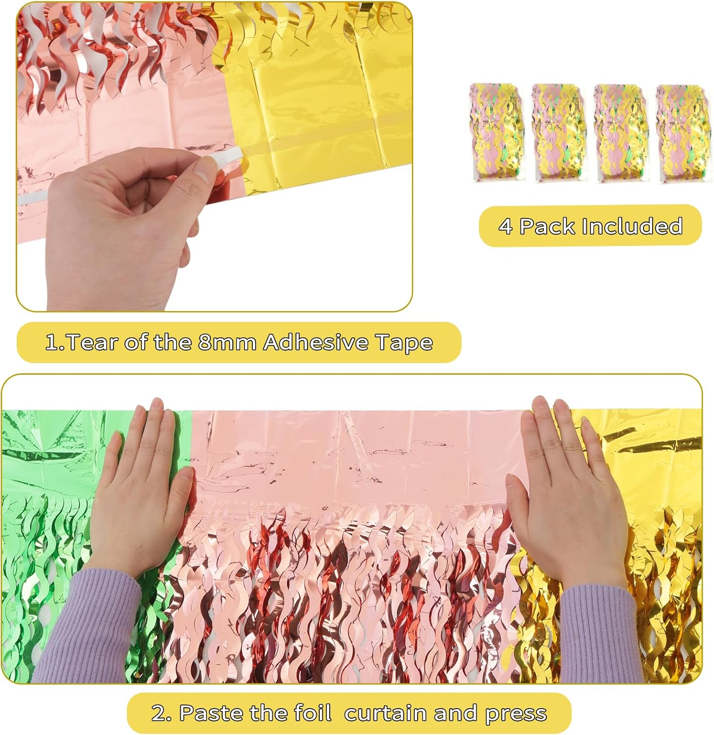 - Easy To Use: This foil backdrop comes with double sided tape on the back of them, what you need to do is just gently take it out of the package, peel the tape off then paste the fringe curtain on the top of wall or door