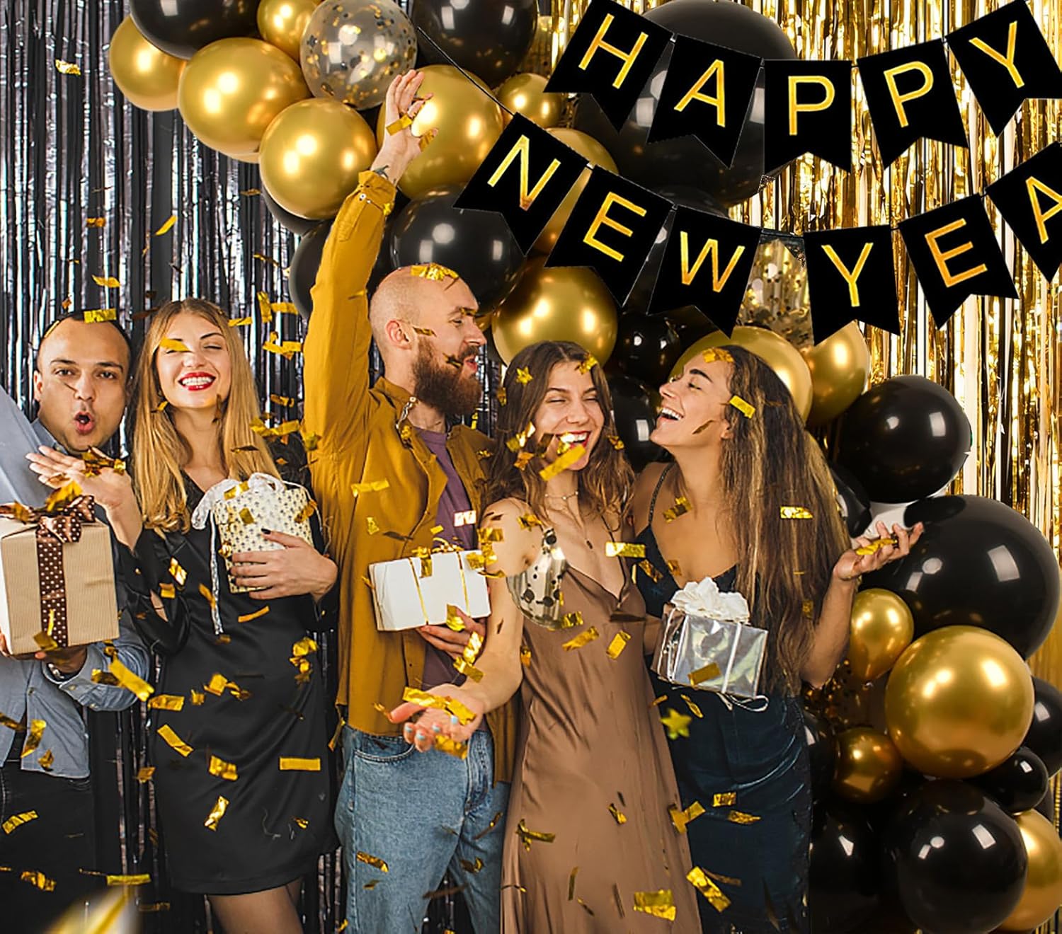- What You Get: 1 pc gold 3.28ft x 6.56ft (1mX2m) and 1 pc black 3.28ft x 6.56ft tinsel foil fringe curtain/backdrops, enough length for decorate your party decorations