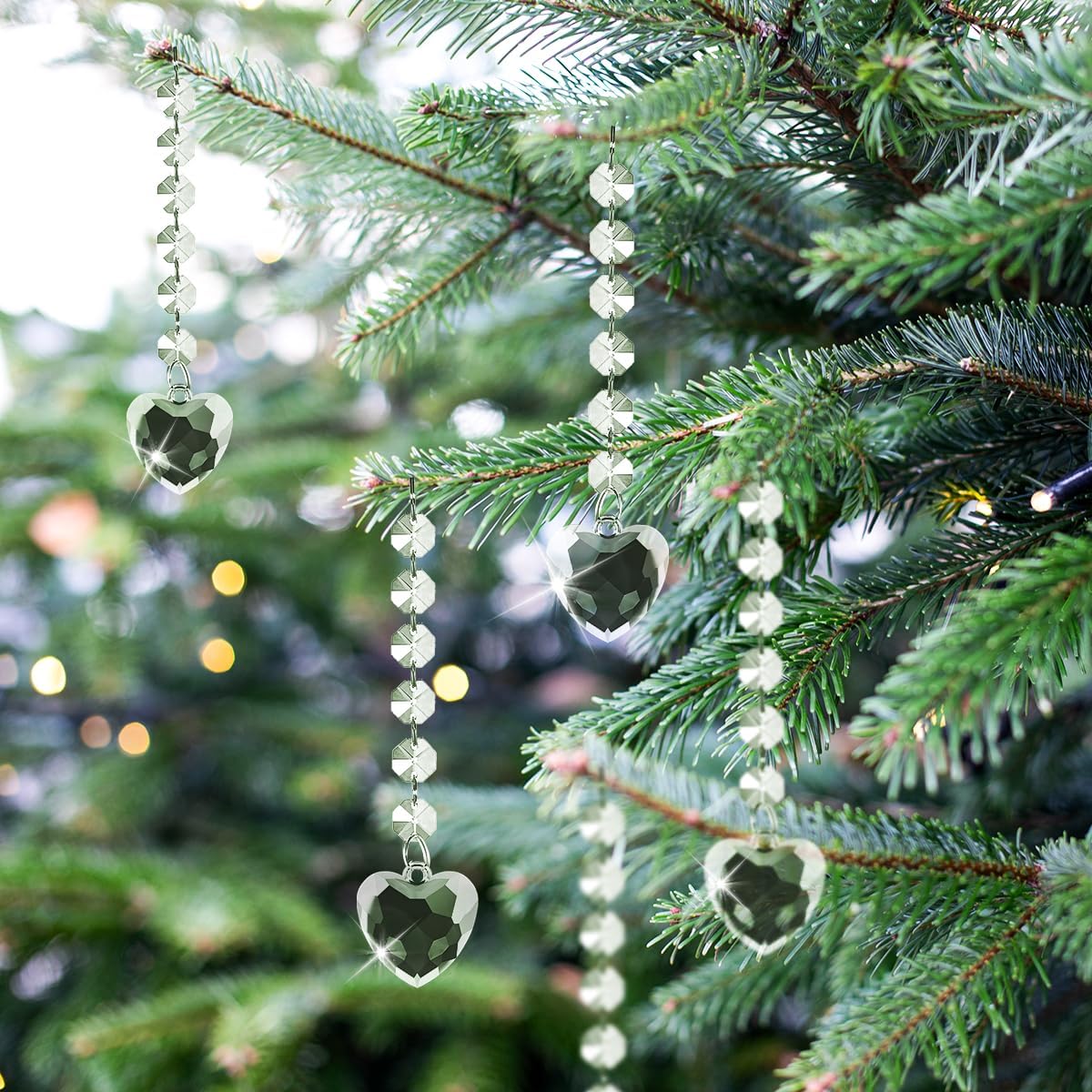 - Elegant Hanging Ornaments: Designed with teardrop acrylic prisms, combined with clear plastic icicle drops adorned with crystal beads, creating a festive and romantic ambiance. Ideal for decorating Christmas trees, centerpieces, chandeliers, windows, and various corners of your home.