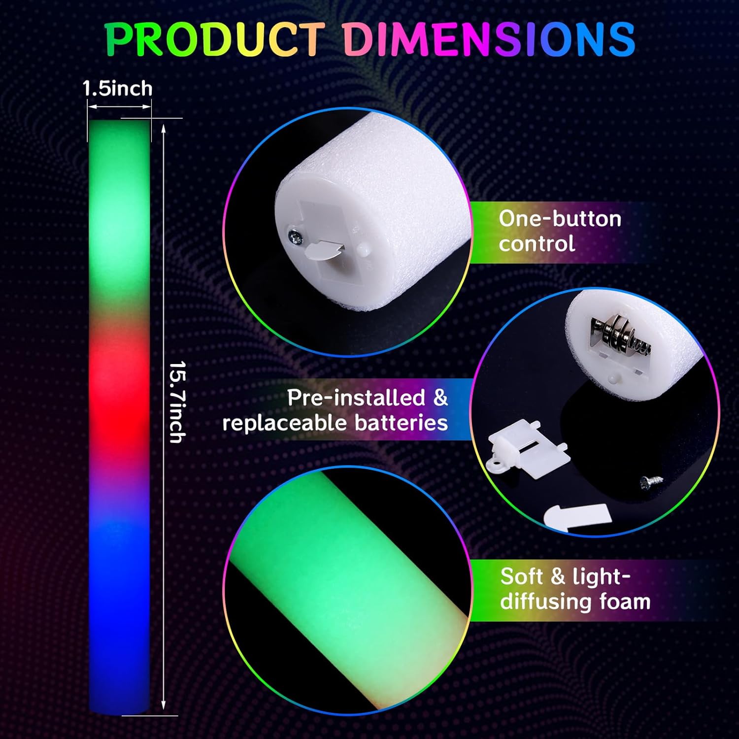 - 24-Pack Multicolor LED Foam Glow Sticks – Bright & Vibrant Party Lights: Each 16 x 1.6-inch glow stick features vibrant red, green, and blue LED lights, creating a stunning neon effect that catches everyone’s attention. Perfect for concerts, raves, weddings, birthdays, festivals, and night events, these light-up wands add energy and fun to any celebration!